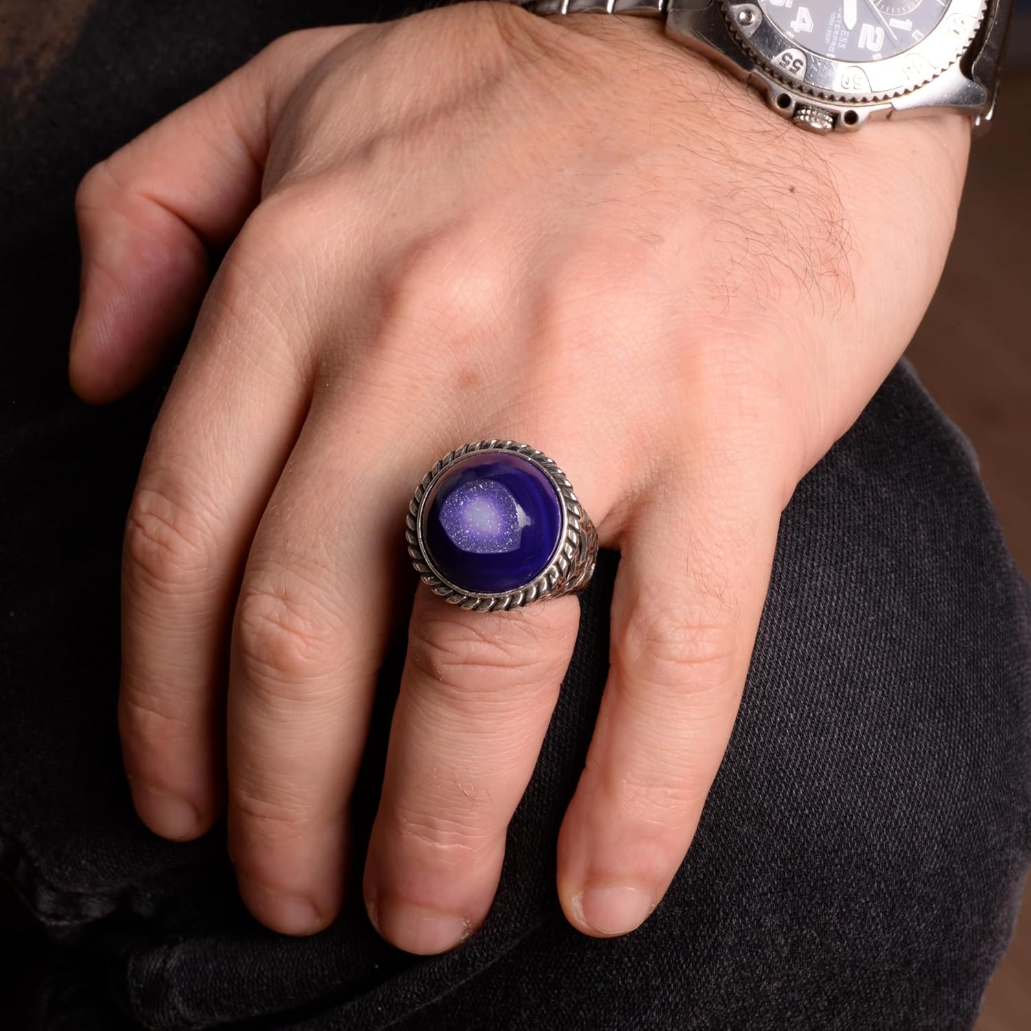 Erkekler için 925 Ayar Gümüş Yüzük, Doğal Druzy Kuvars: Mavi, Yeşil, Kırmızı Varyasyonlar (Mor)