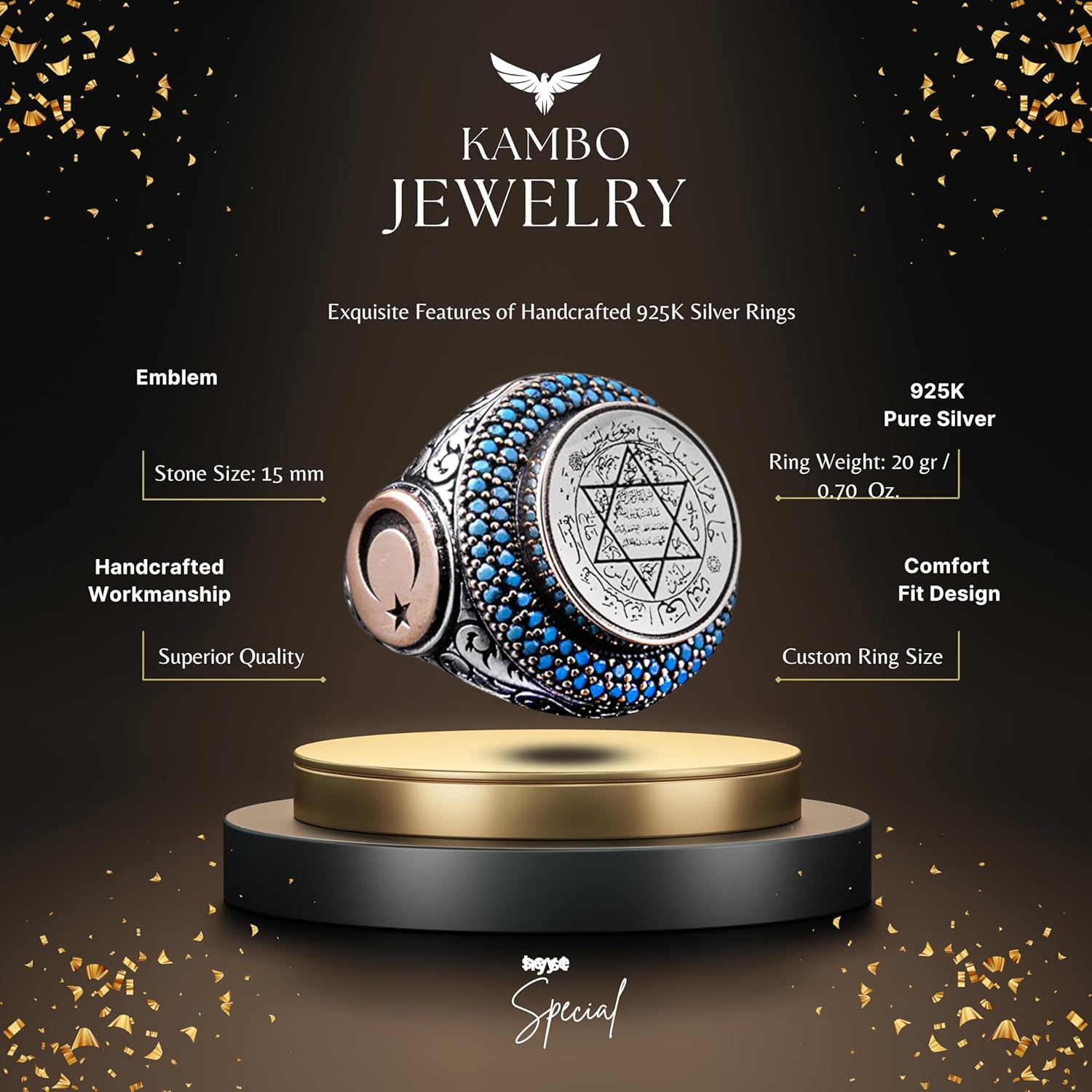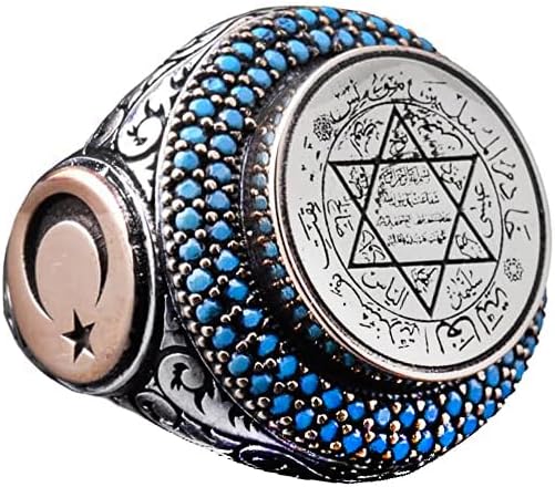 Erkekler için İslami Davud Yıldızı Yüzüğü, Hilal ve Turkuaz İçi, 925 Ayar Gümüş El Yapımı Orta Doğu Tasarımı
