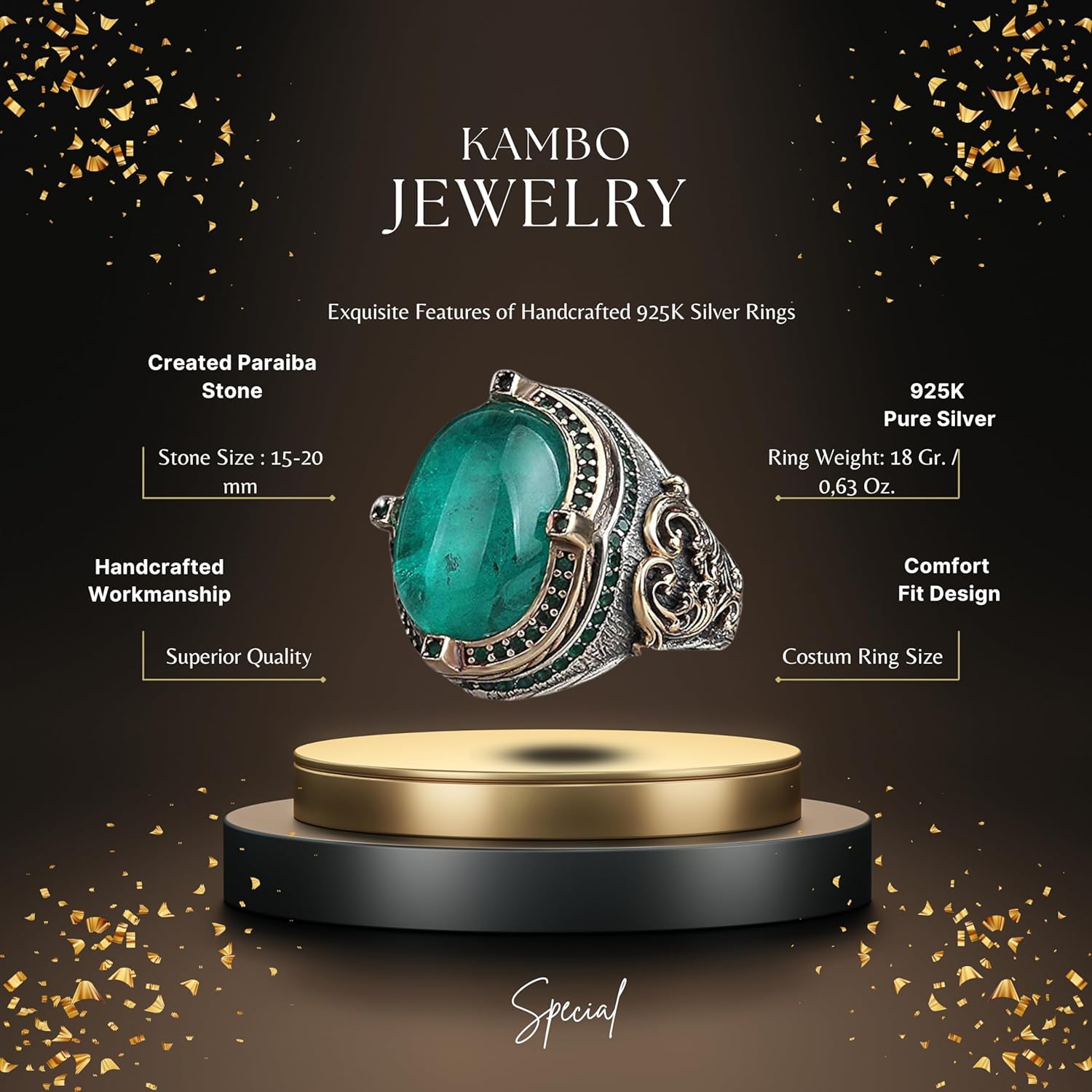 Erkekler için Gümüş Yüzük - Oluşturulmuş Paraiba Taşı