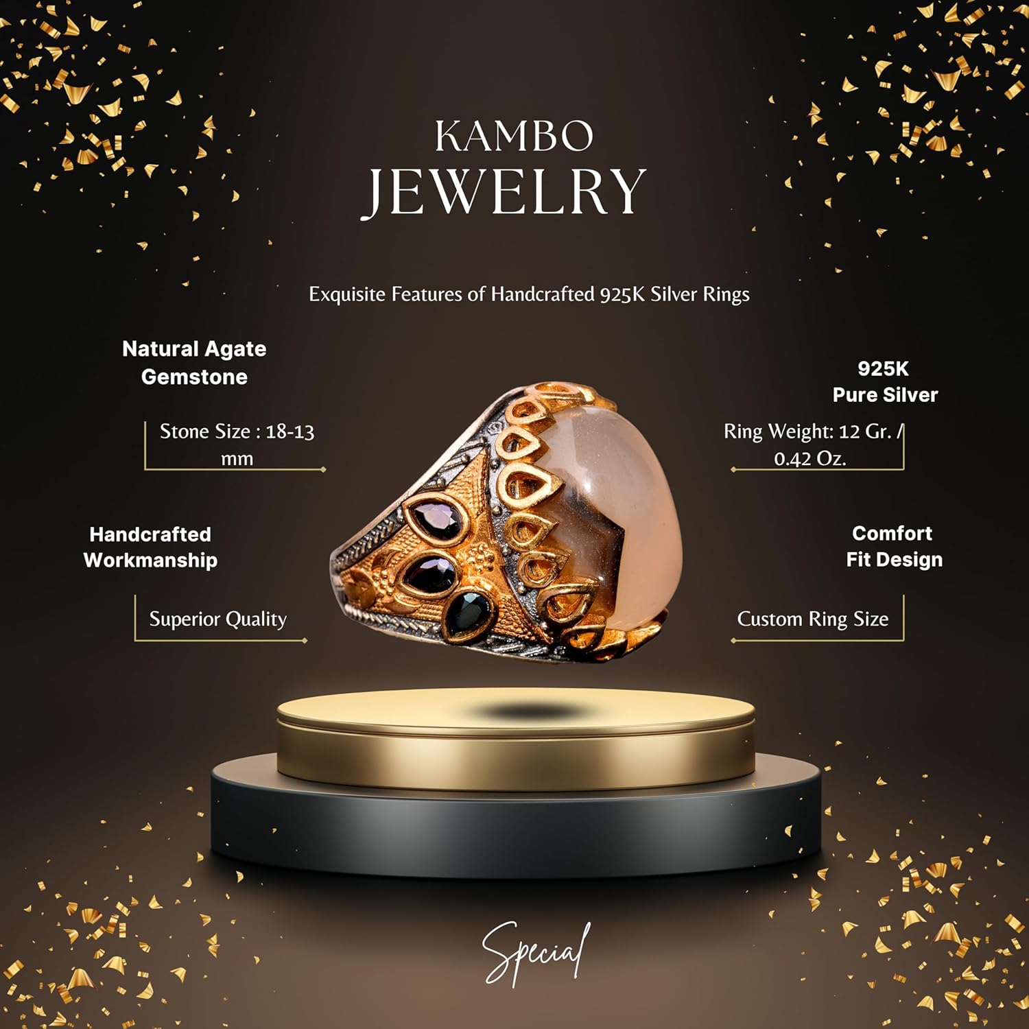 Erkekler için Gümüş Yüzük - Gerçek Doğal Yemen Akik Taşı