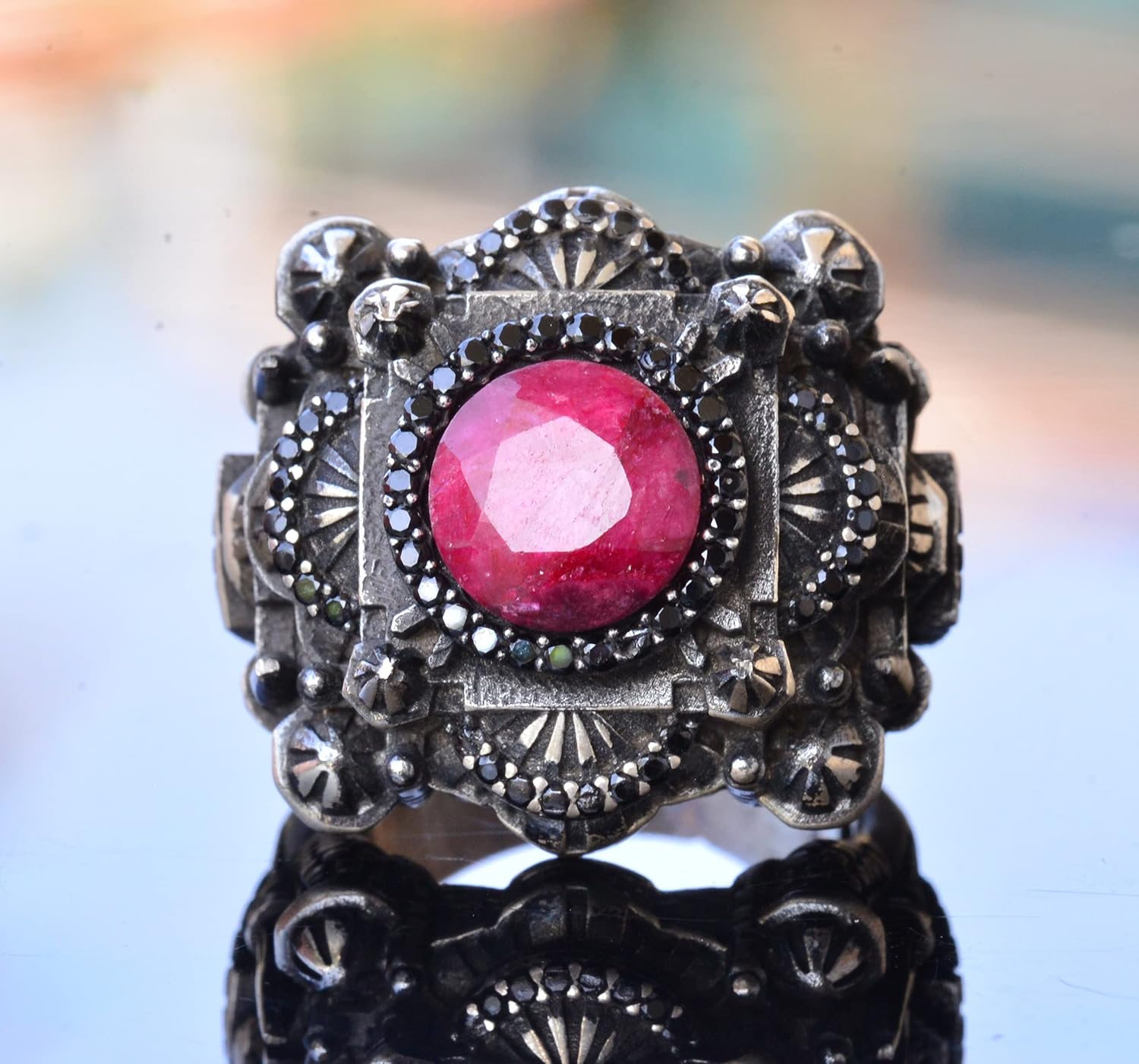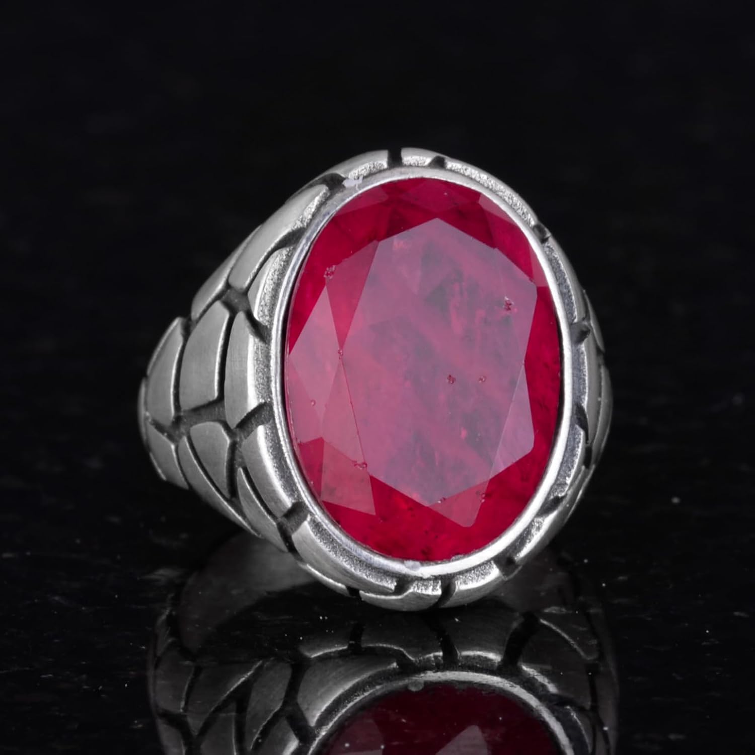 Erkekler için Lüks 925 Ayar Gümüş Yüzük - Yakut Taşlı - Zarif ve Görkemli Tasarım