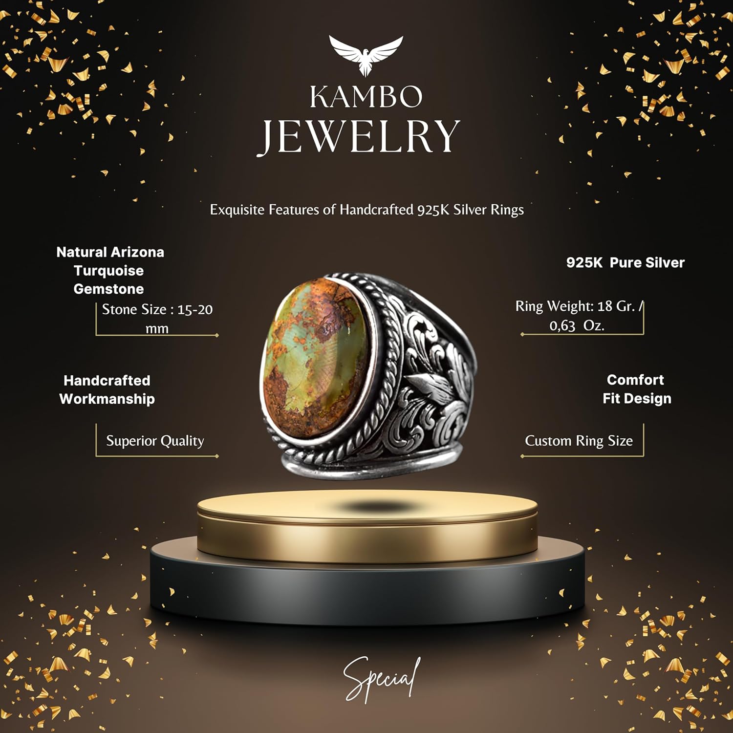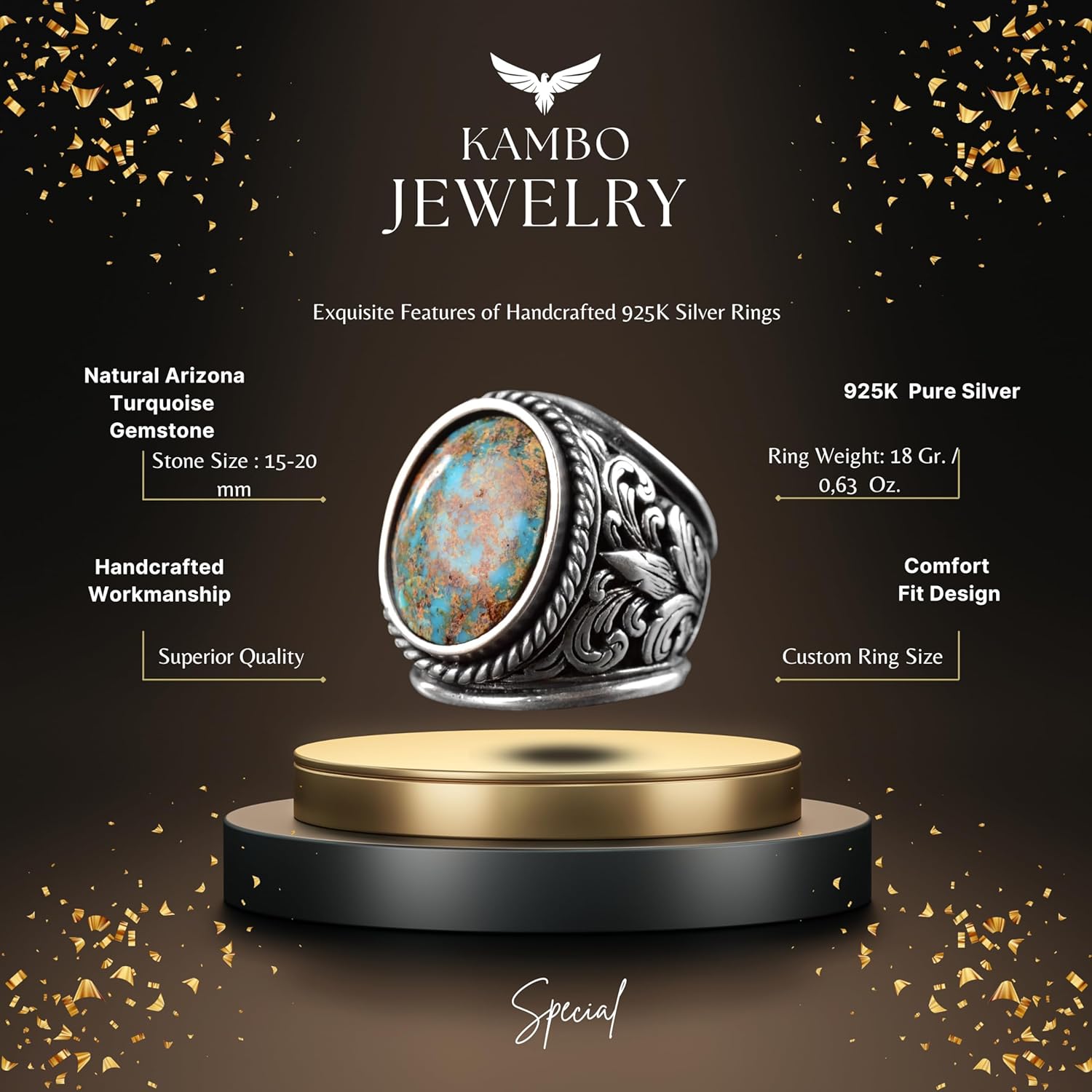 Erkekler için Sterling Gümüş Yüzük - Doğal Arizona Turkuaz Taşı ile Altın Aksan