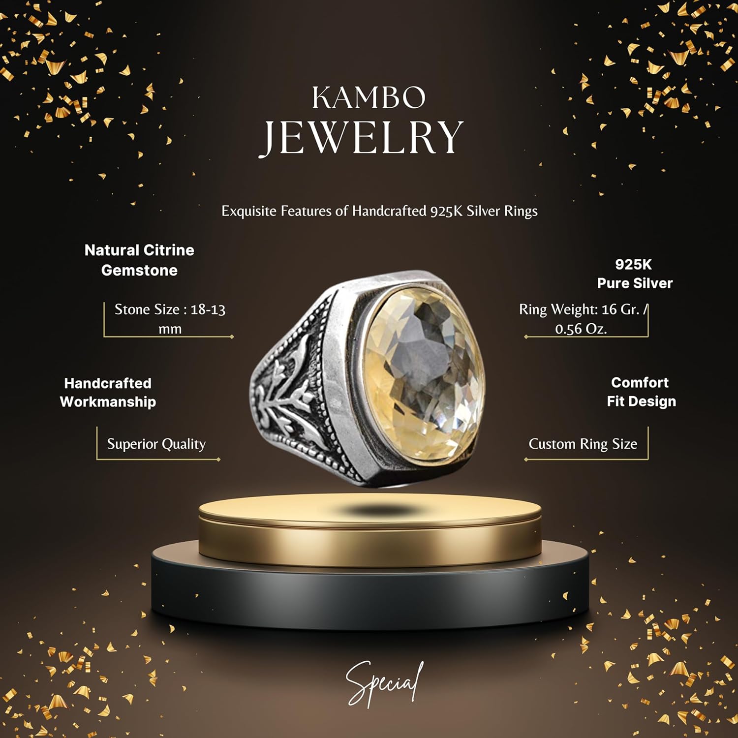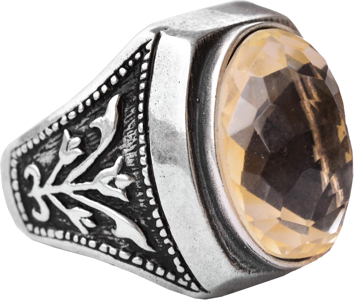 Erkekler için Sterling Gümüş Yüzük - Doğal Oval Sitrin Taşı ve Lale Motifli Tasarım