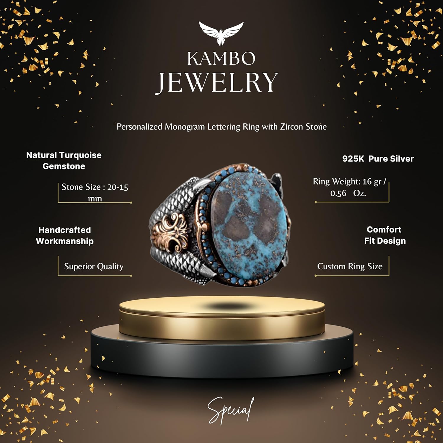 Erkekler için Turkuaz Taş Yüzük, 925 Ayar Gümüş El Yapımı Ejderha Ölçeği Tasarım