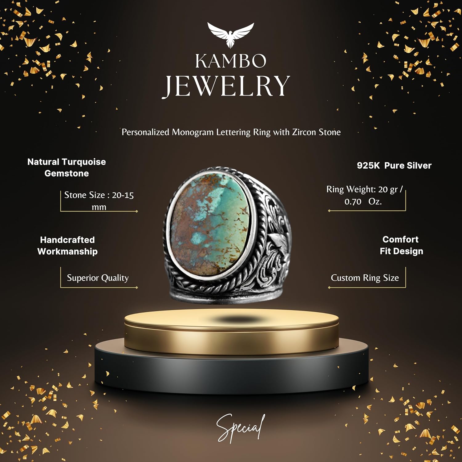 Erkekler için Turkuaz Taş Yüzük, 925 Ayar Gümüş El Yapımı Ejderha Derisi Tasarımı, Modern Tarzda Şifa Kristali Takı (Model-1)