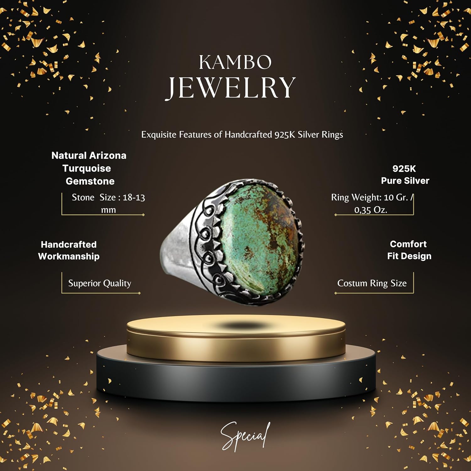 Gerçek Arizona Yeşil Turkuaz Taş Yüzük, 925 Ayar Gümüş Yüzük Erkekler İçin