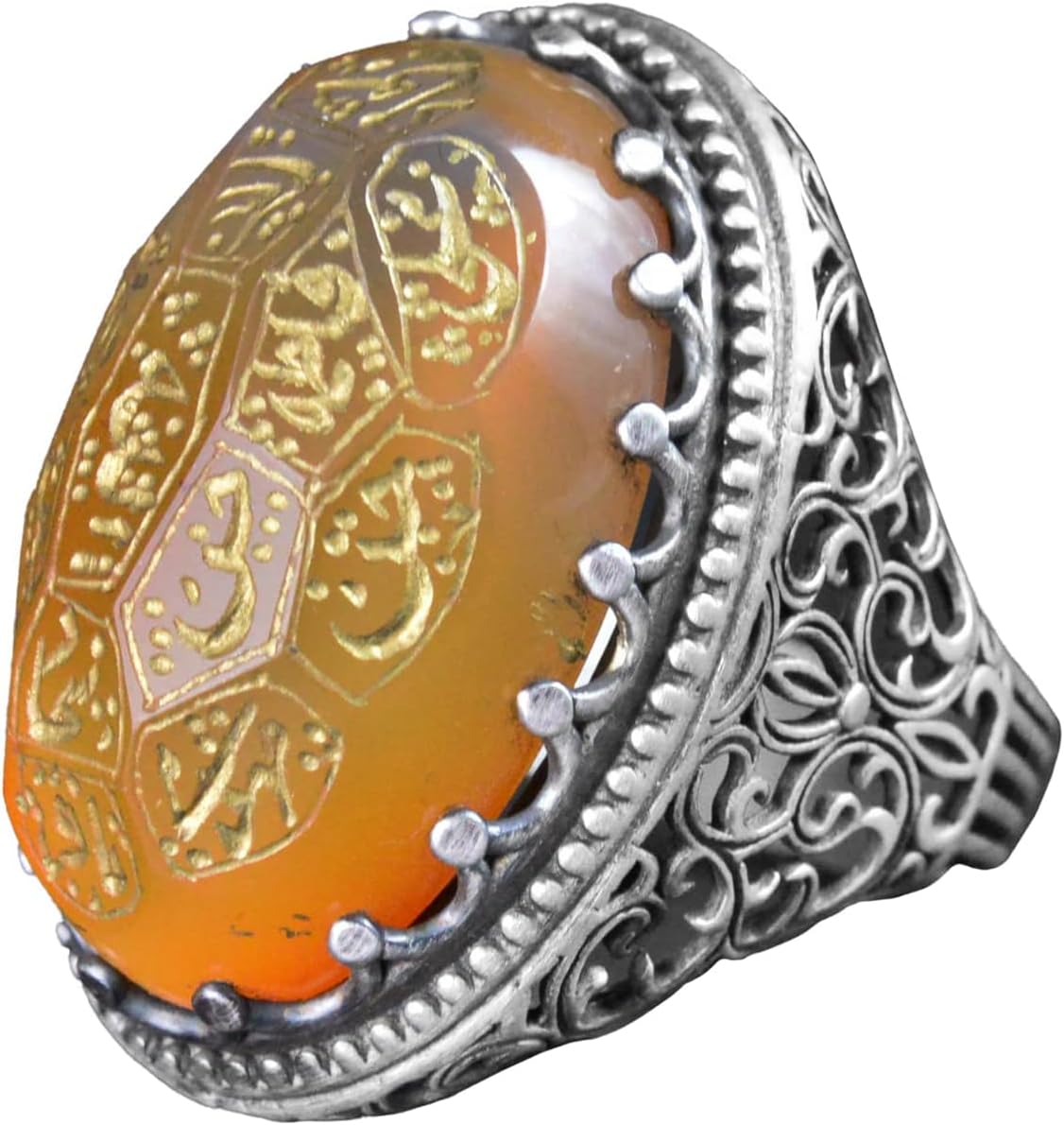Gerçek Doğal Akik, İslami Şeriat Yazılı Yüzük - 925 Ayar Gümüş El Yapımı Erkek Büyük Yüzük