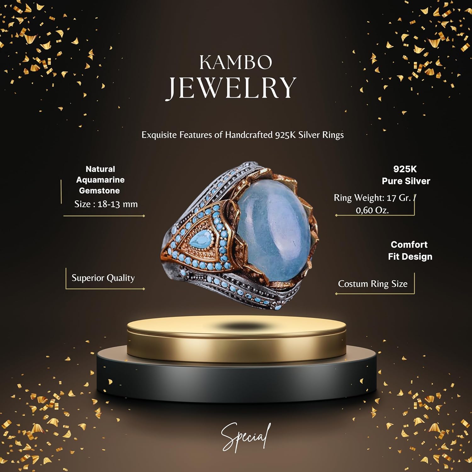 Gerçek Doğal Akvamarin Taş Yüzük, El Yapımı Turkuaz Aksamlar, 925 Ayar Gümüş Erkek Yüzük