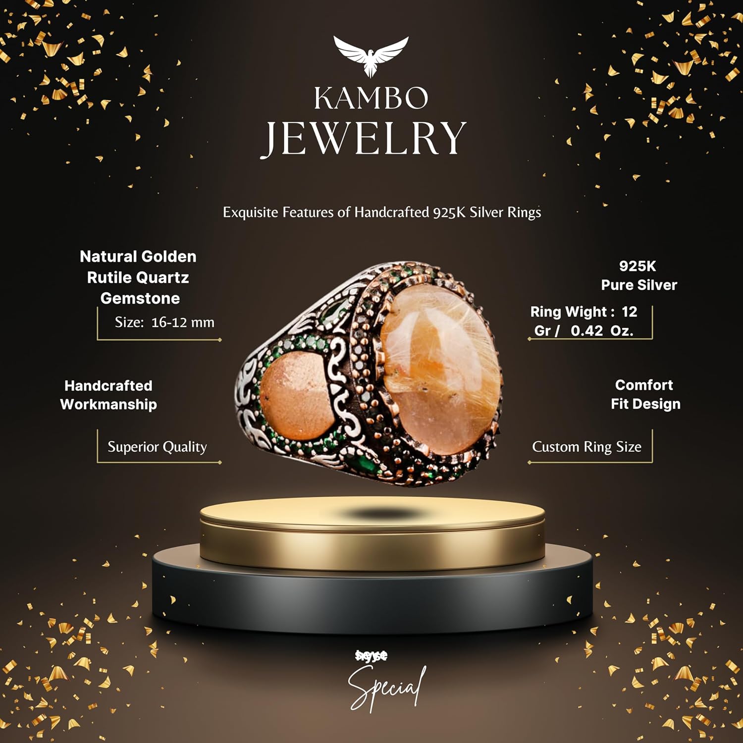Gerçek Doğal Altın Rutilit Kuvars Taş Yüzük, Sterlin Gümüş Erkek Yüzük