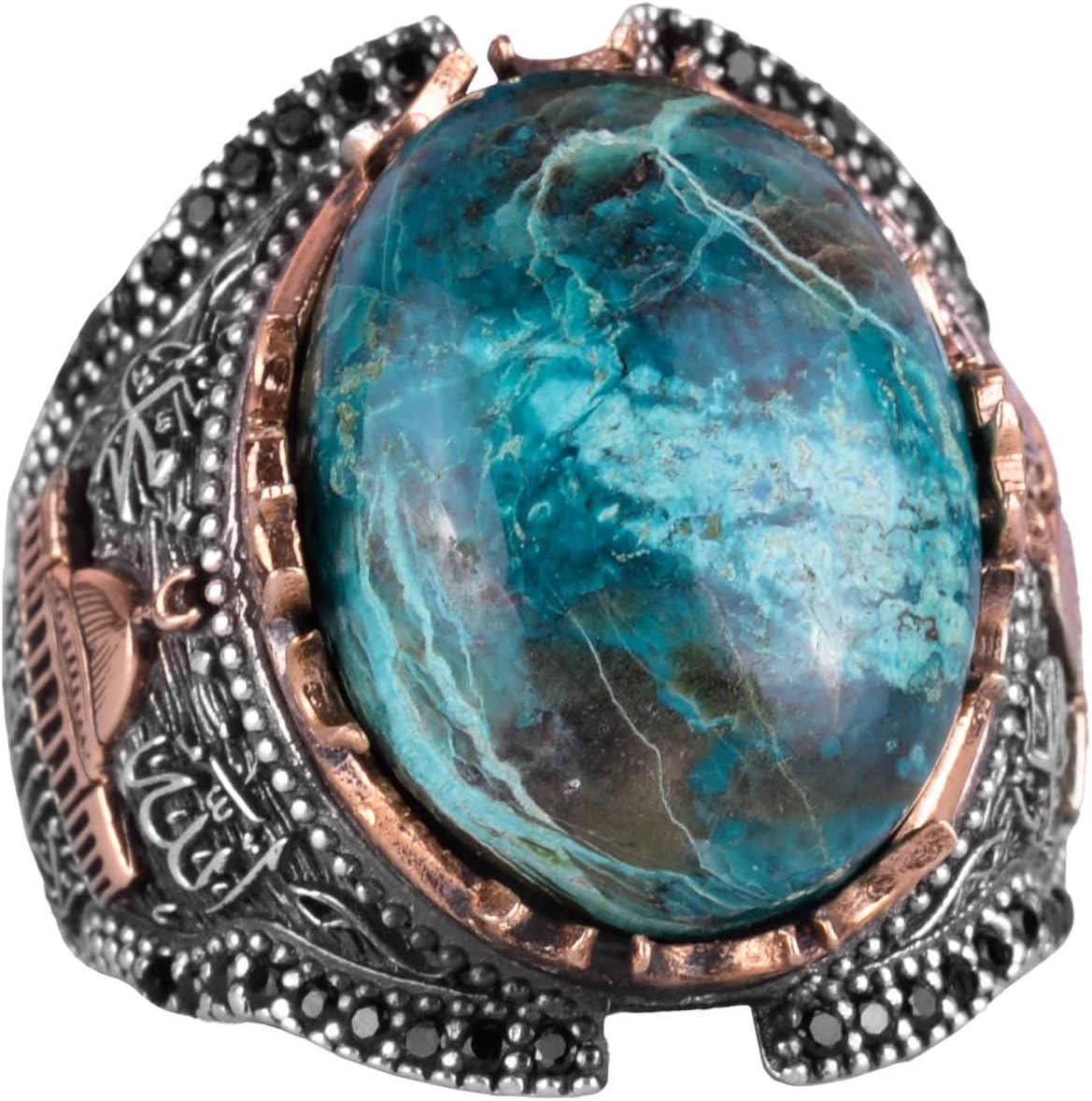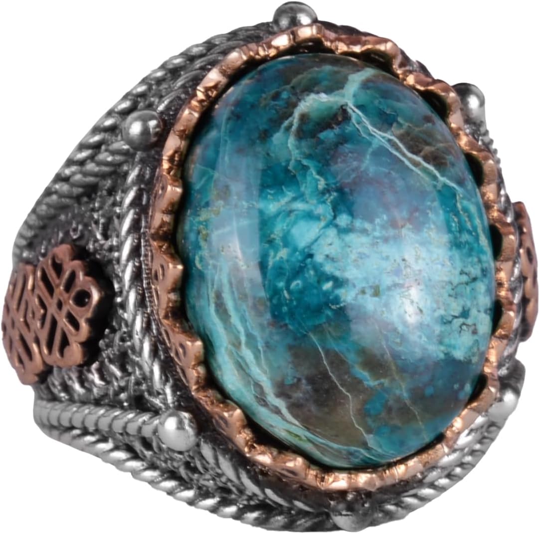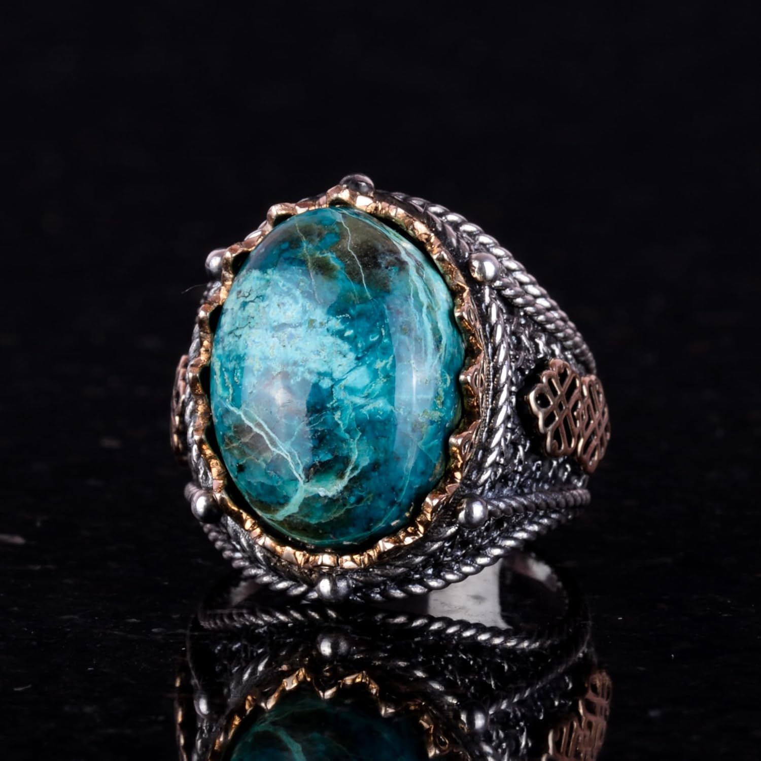 Gerçek Doğal Krysokolla Taşı Yüzük, 925 Ayar Katı Sterlin Gümüş Erkek Yüzüğü