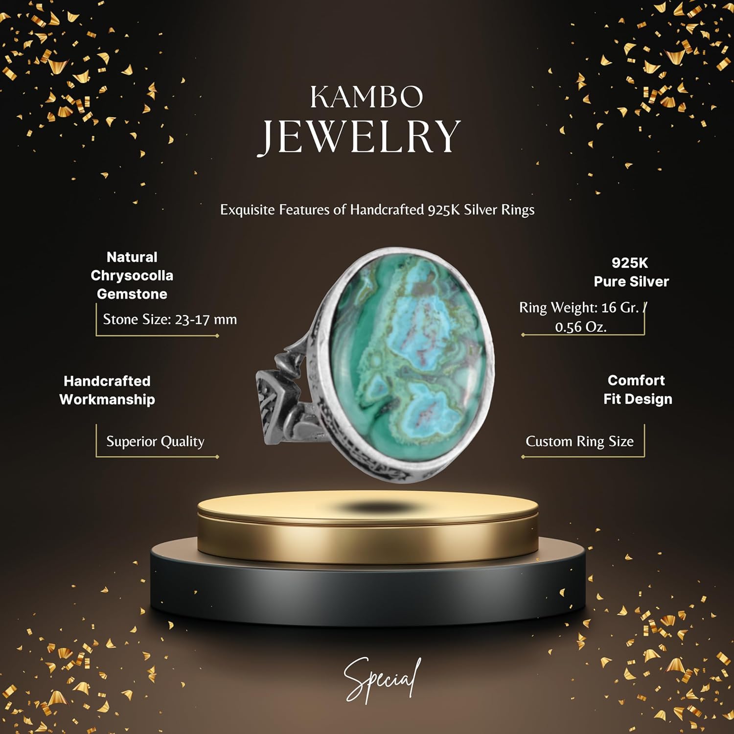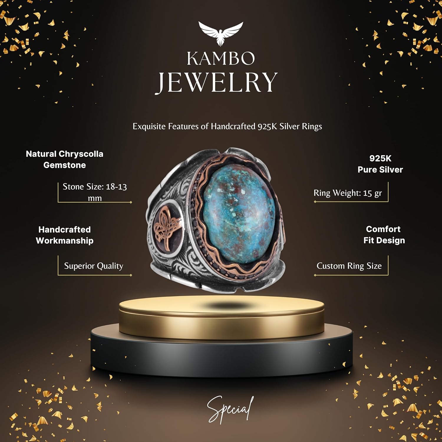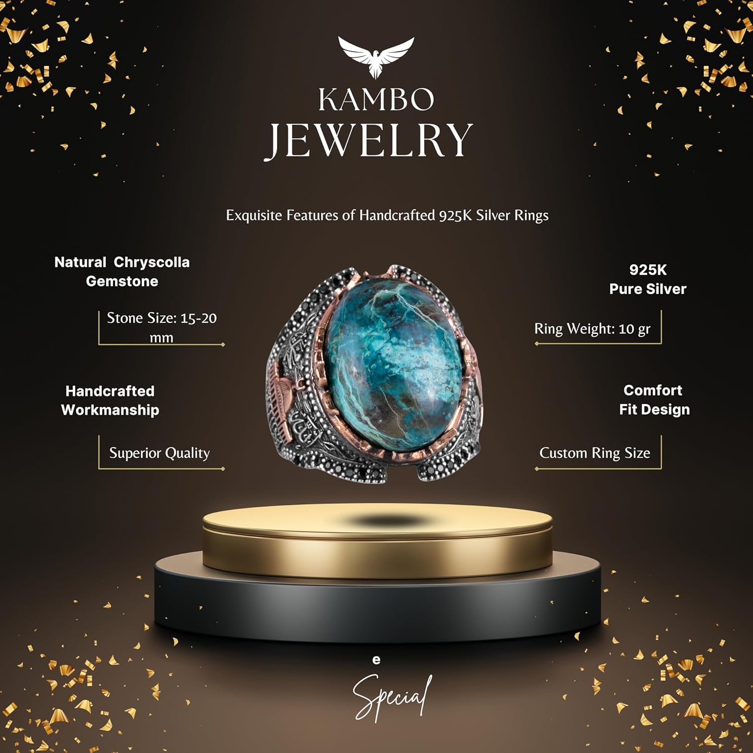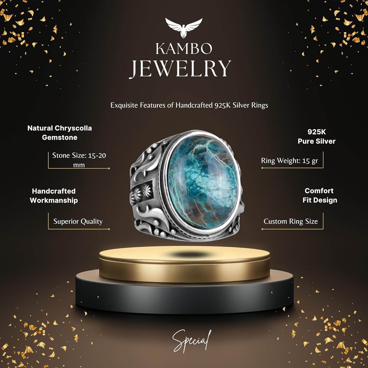 Gerçek Doğal Krysokolla Taşlı Yüzük, 925 Ayar Sert Gümüş Erkek Yüzüğü, Tasarım Gümüş Erkek Yüzüğü