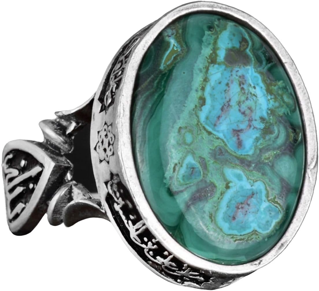 Gerçek Doğal Krysokolla Taşı Yüzük, Osmanlı Tuğra Gümüş Yüzük, 925 Ayar Katı Gümüş Erkek Yüzüğü