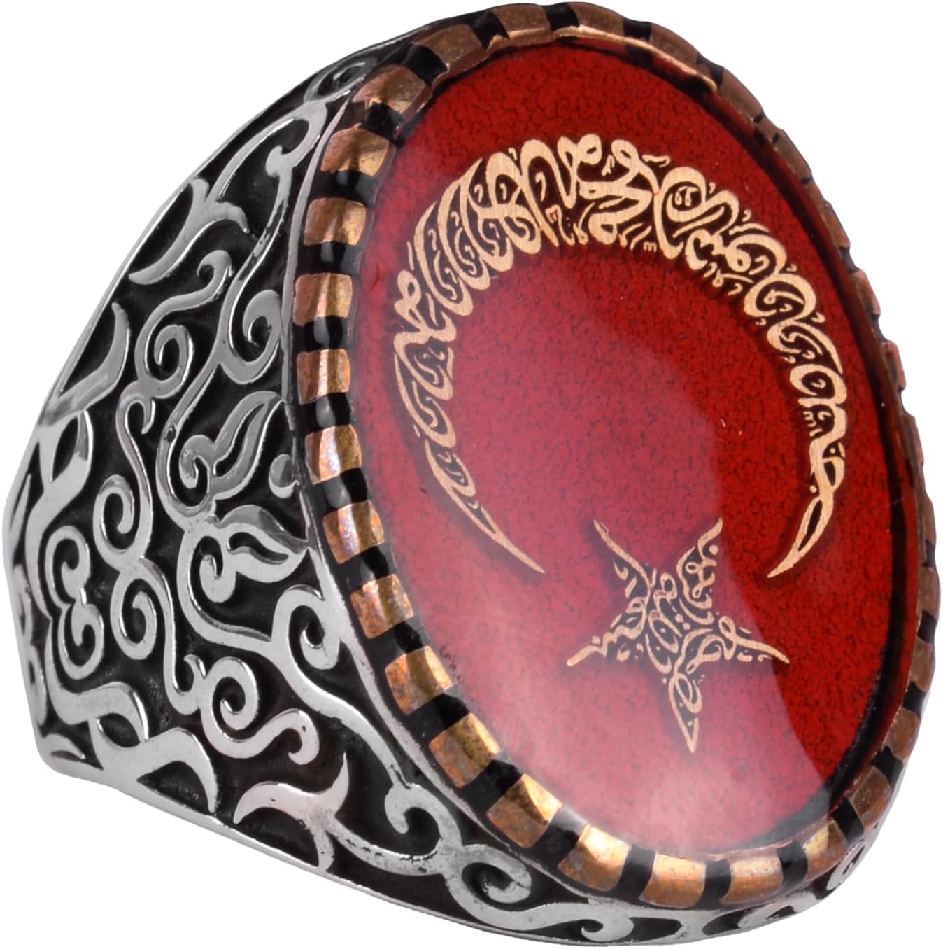 925 Ayar Gümüş Erkek Yüzük - Yapay Taş ile Ay ve Yıldız Tasarımı - Gümüş Yüzük