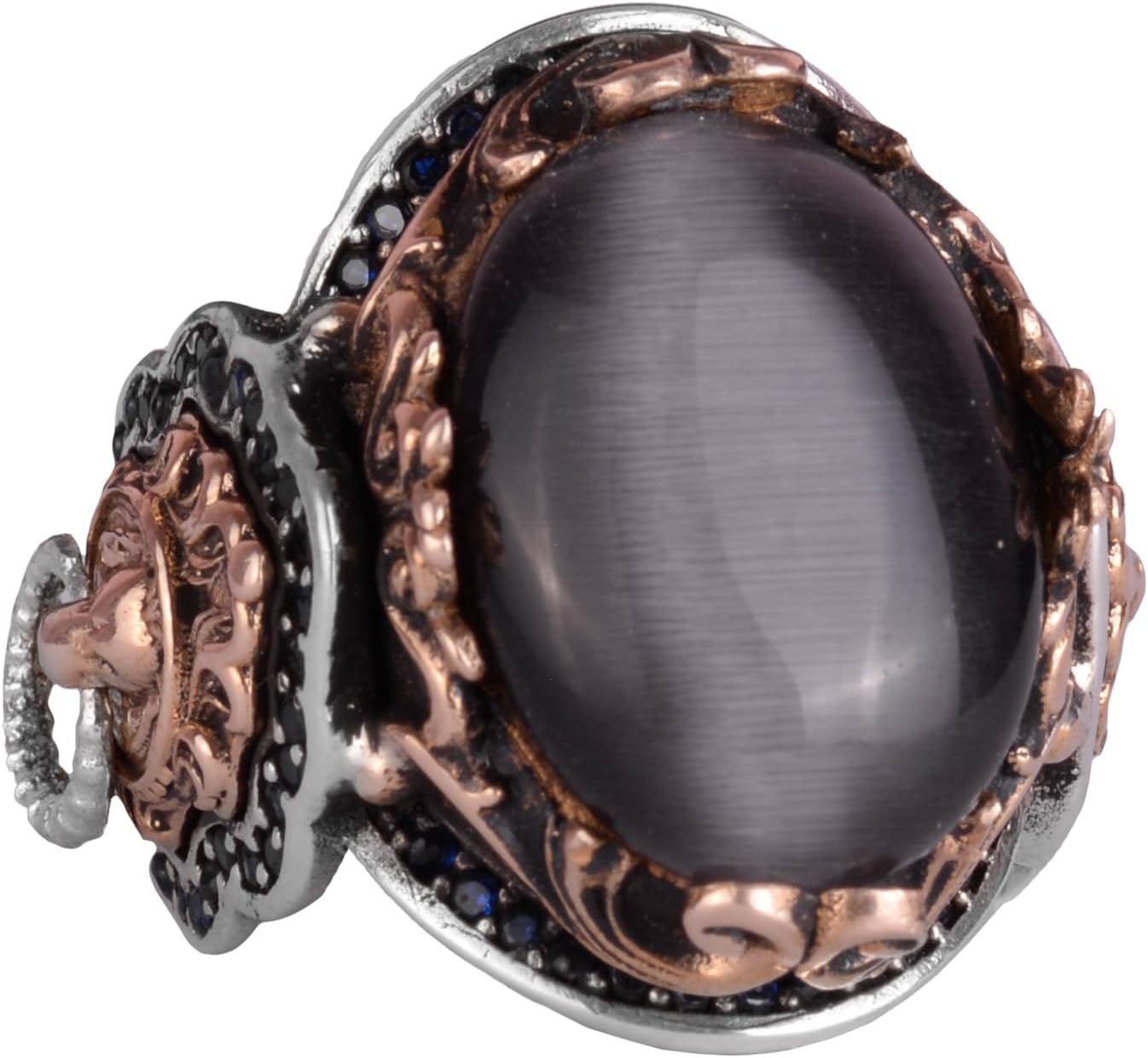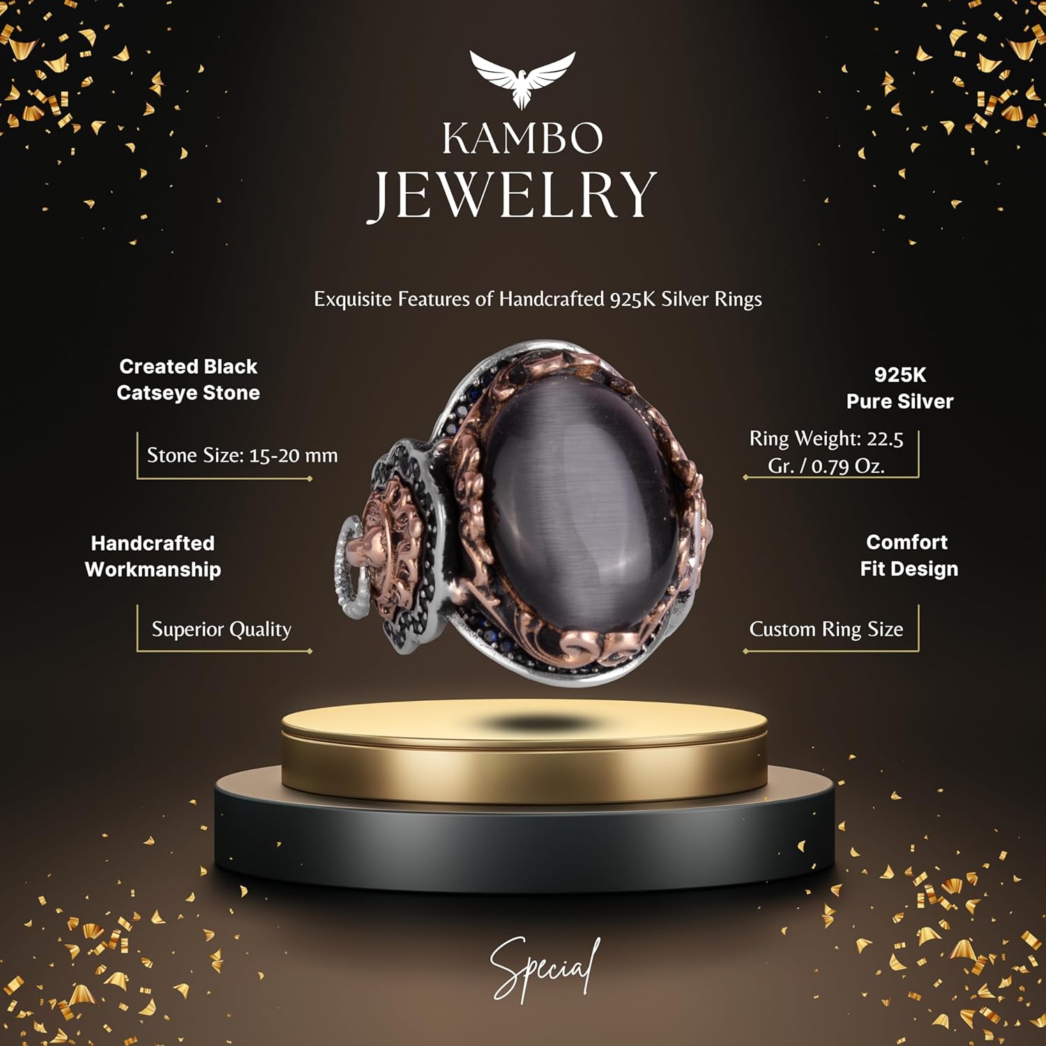 925 Ayar Gümüş Erkek Yüzük - Siyah Kedi Gözü Yapay Taş - Aslan Sembolü El Yapımı Yüzük