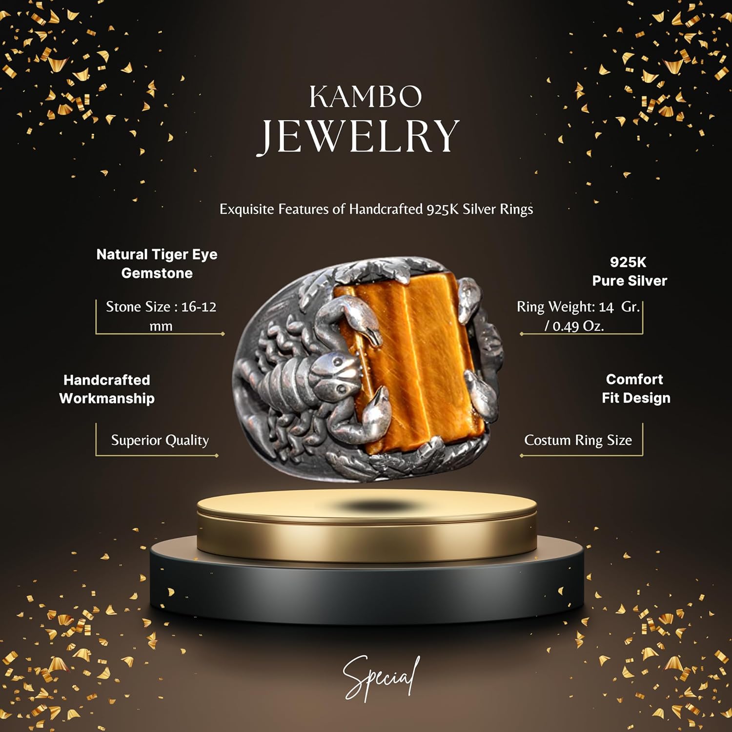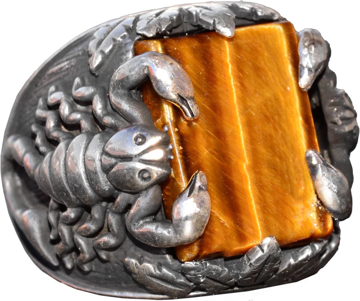El Yapımı Gümüş Erkek Yüzük | Doğal Kaplan Gözü Taşı ve Akrep Tasarımı | Cesur ve Koruyucu