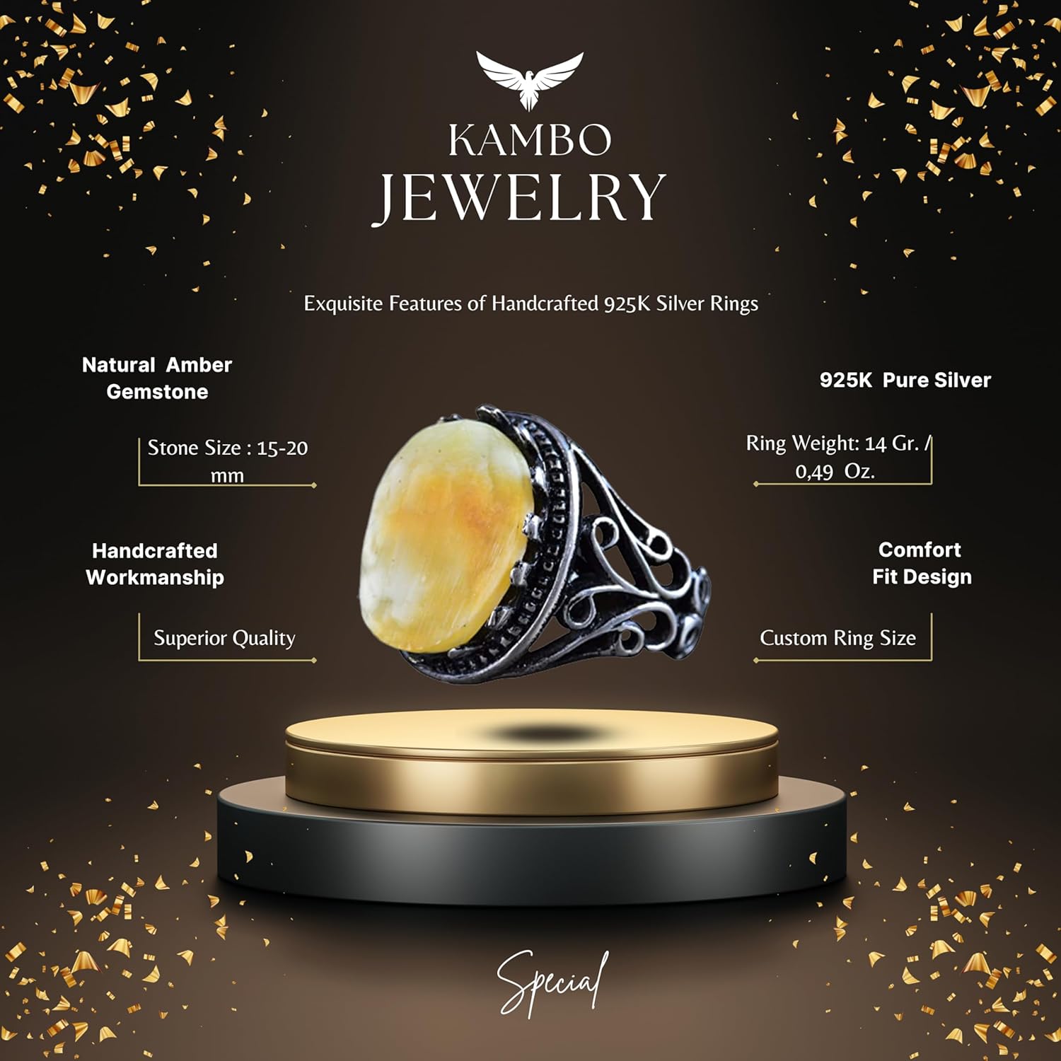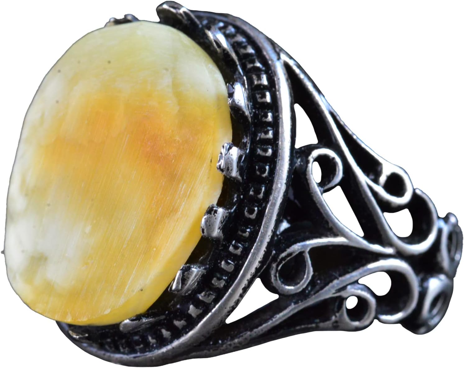 El Yapımı Ham Amber Yüzük, 925 Ayar Gümüş Erkek Yüzüğü, Doğal Şifa Taşı