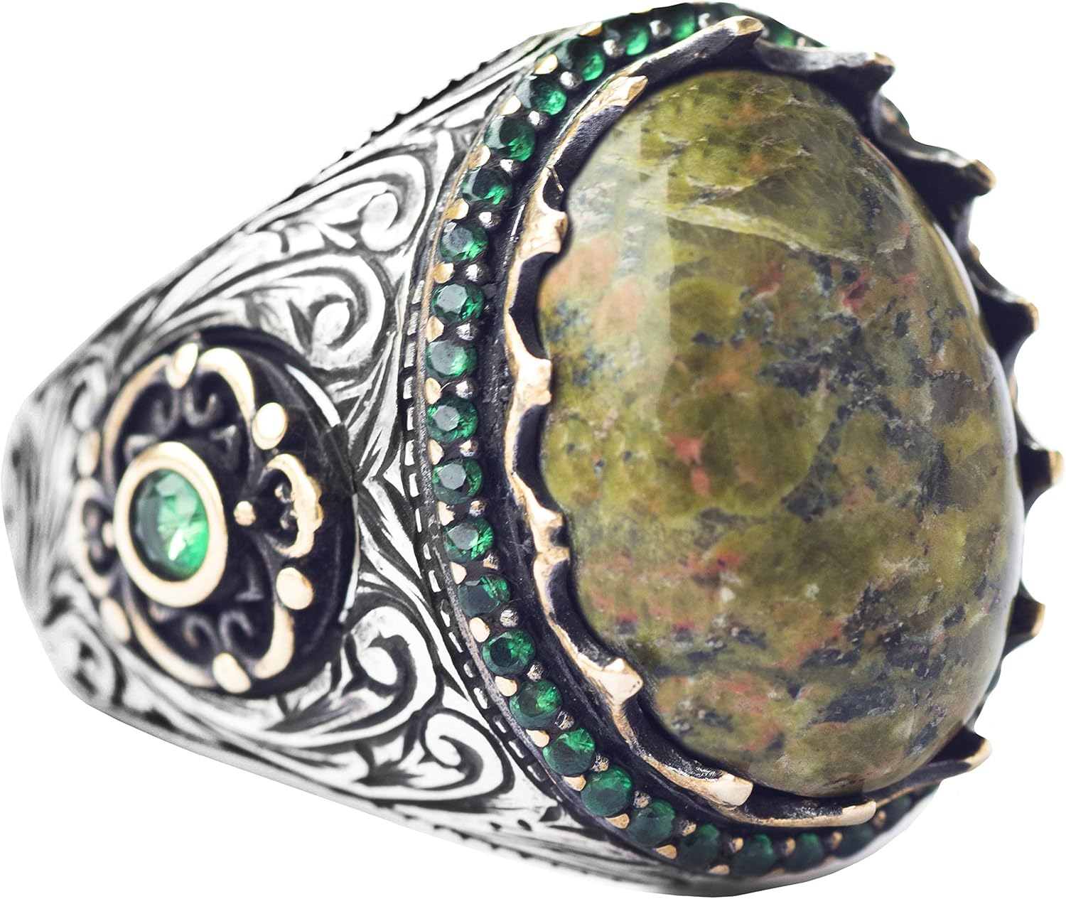 El Yapımı Gümüş Erkek Yüzük, Gerçek Doğal Taş Yüzük (Unakite)