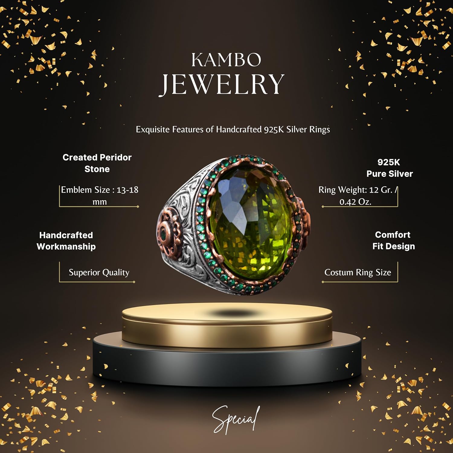 El Yapımı Gümüş Erkek Yüzük | Yeşil Yapay Peridot Taşı | Yenilenme ve Refah Tasarımı