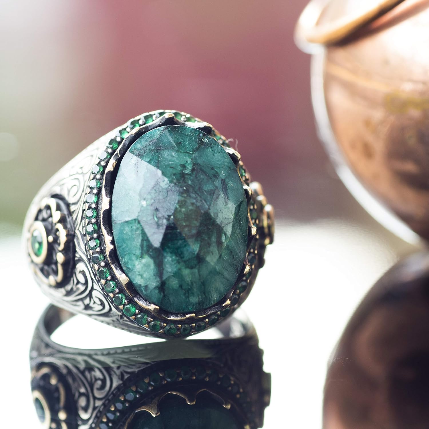 El Yapımı Gümüş Erkek Yüzük, Gerçek Doğal Taş Yüzük (Zümrüt)