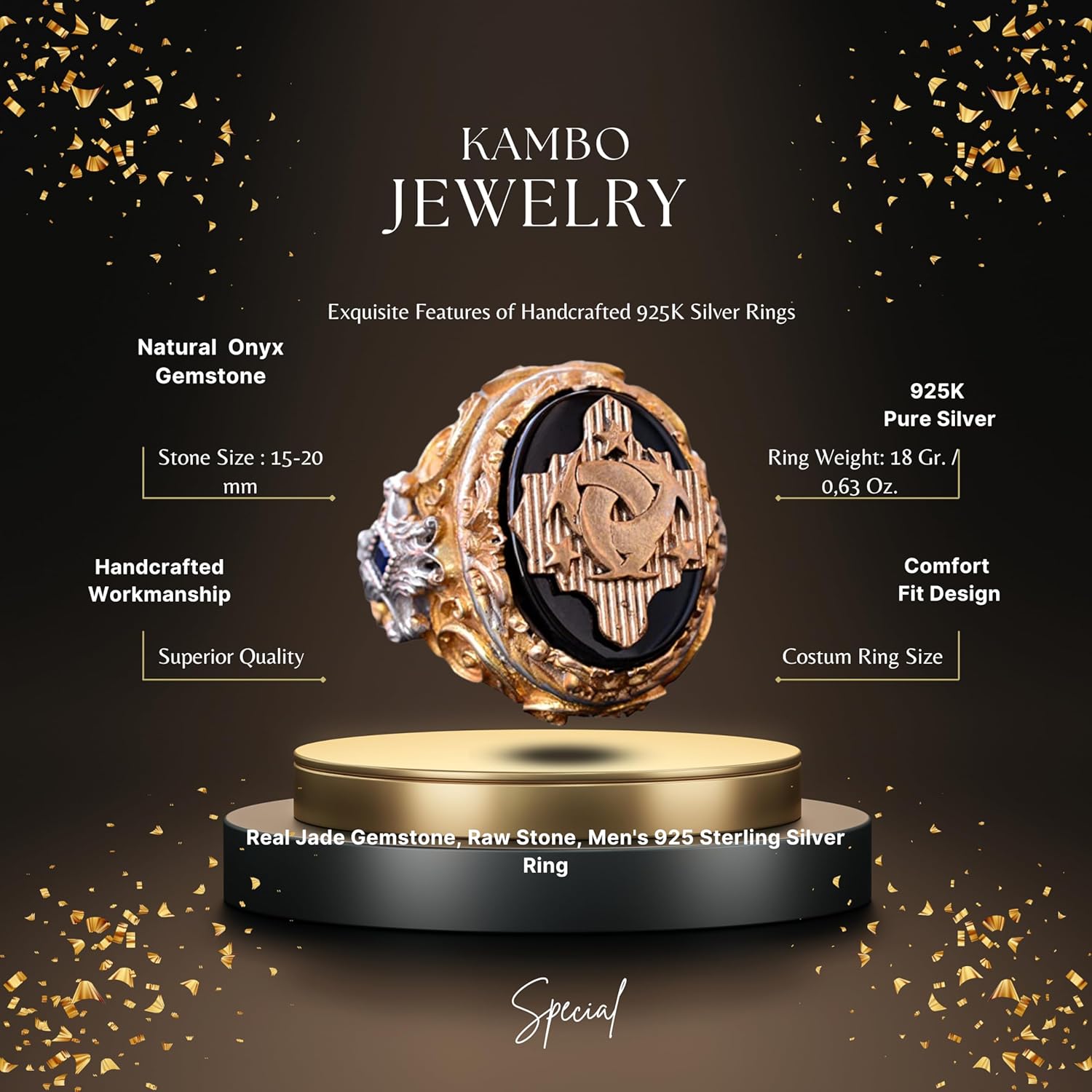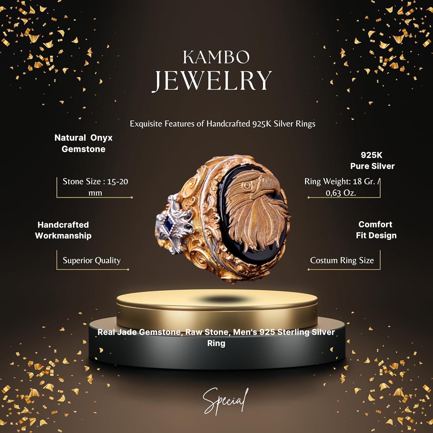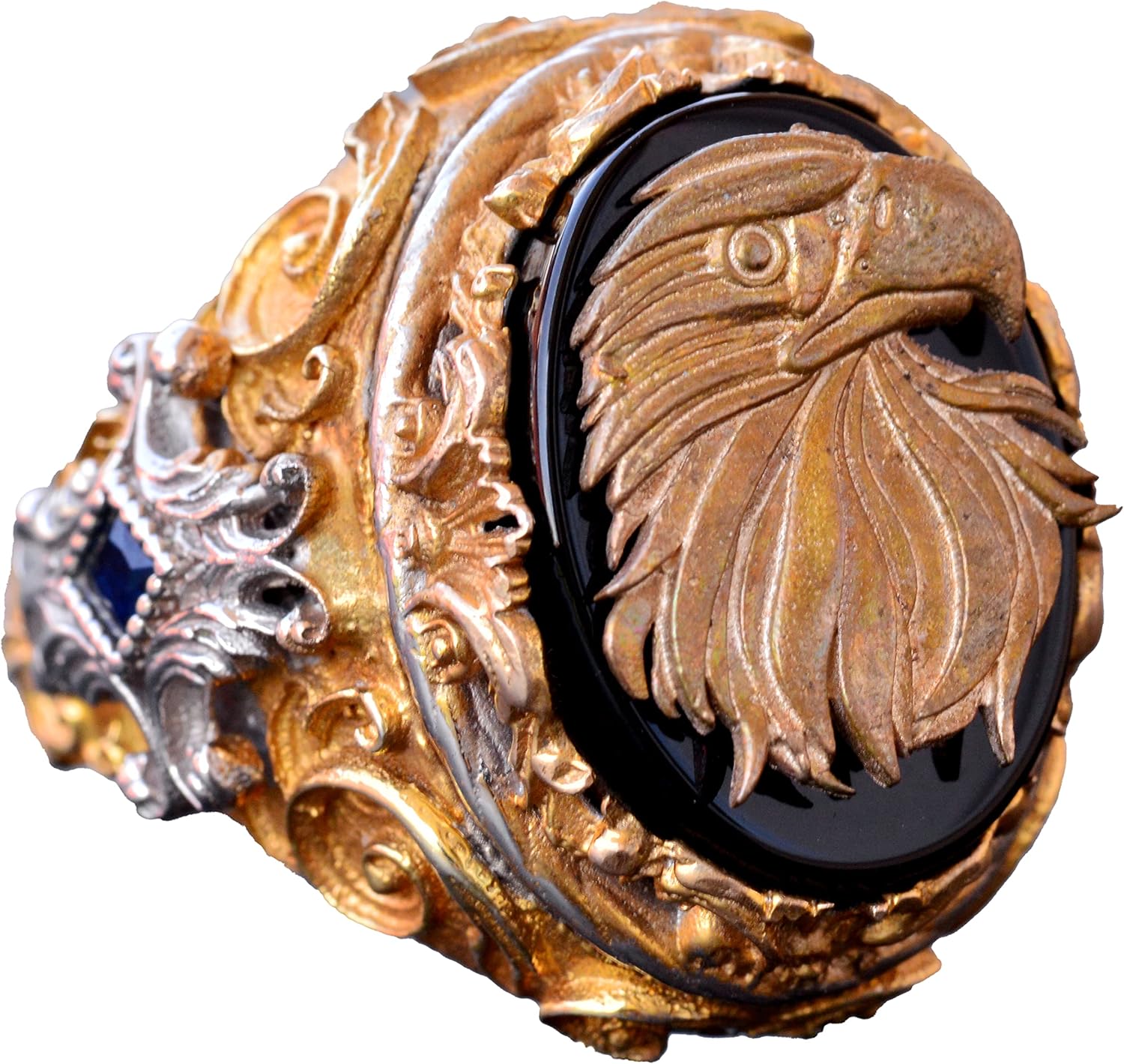 El Yapımı Oniks Yüzük - 925 Ayar Katı Sterlin Gümüş Erkek Altın Kaplama Yüzük (Kartal)