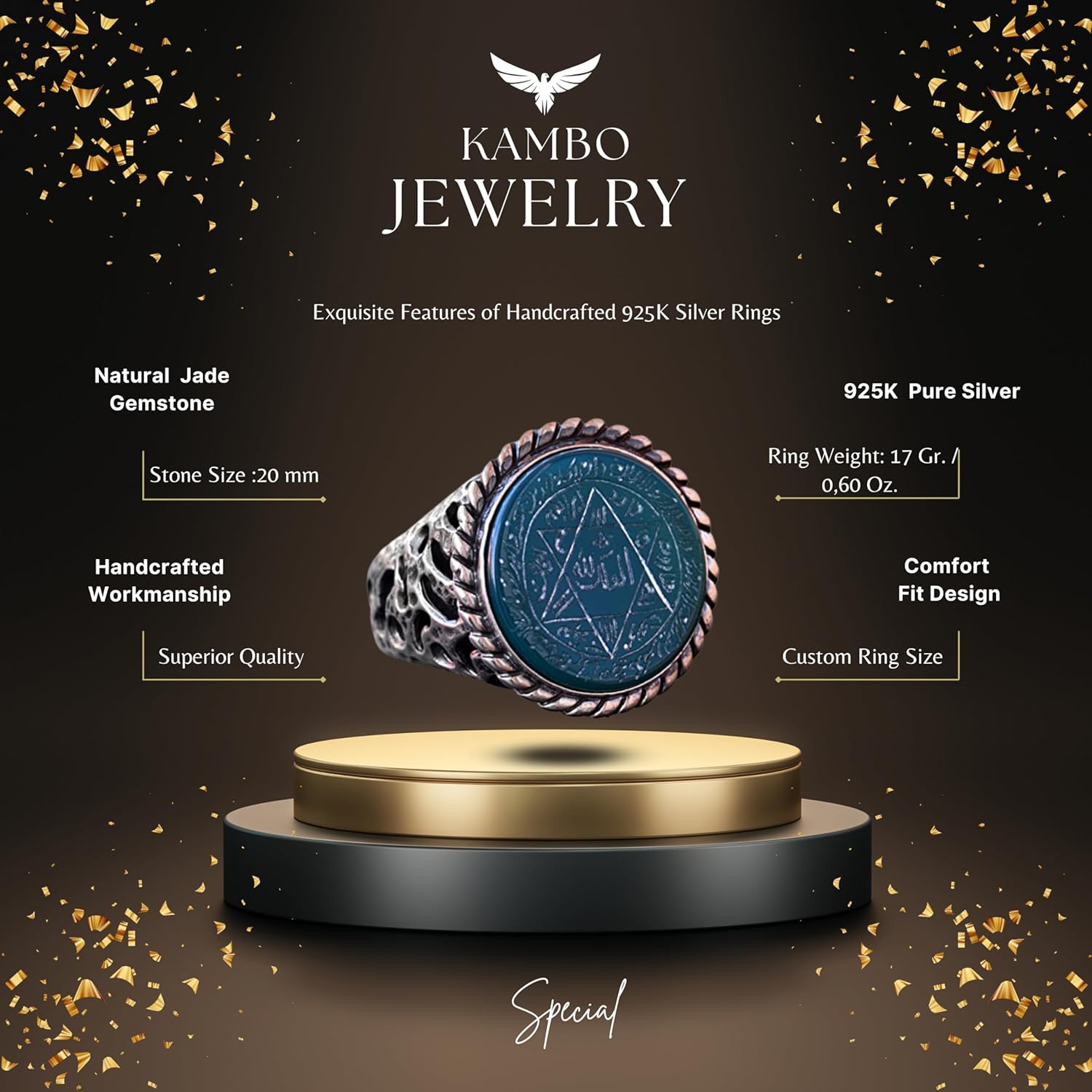 El Yapımı Süleyman Mührü Yüzüğü, Doğal Yeşil Oniks Taşı, İslami Erkek Yüzüğü, 925 Ayar Gümüş