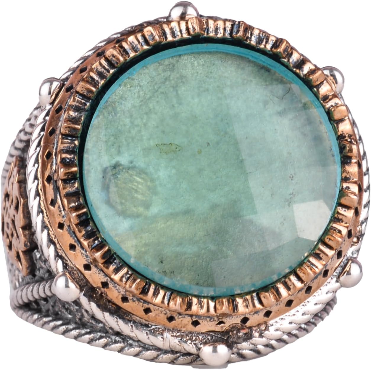 El Yapımı Vintage Tasarım Zümrüt Yüzük - 925 Ayar Gümüş Erkek Yüzük Altın Aksanlı (Akvamarin)