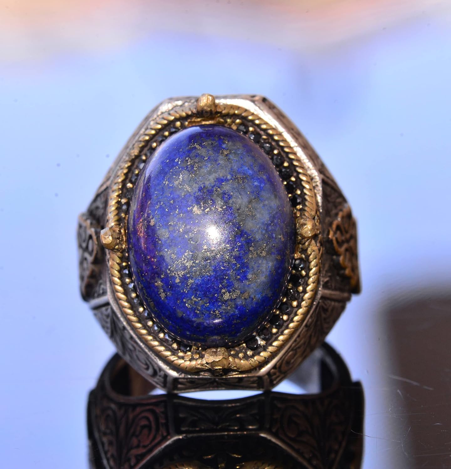 El Yapımı Vintage Tasarım Zümrüt Yüzük - 925 Ayar Gümüş Erkek Yüzük Altın Aksamlarıyla (Lapis Lazuli)