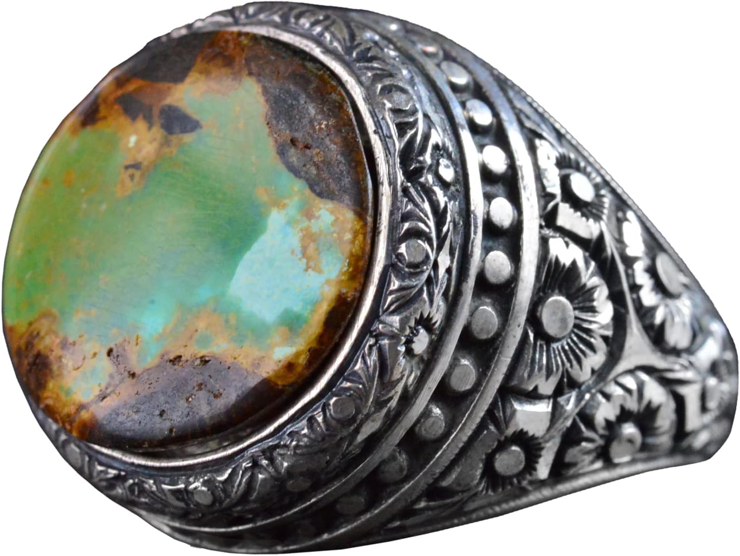 El Yapımı Turkuaz Taş Yüzük, 925 Ayar Gümüş Erkek Yüzüğü, Vintage Çiçek Tasarımı