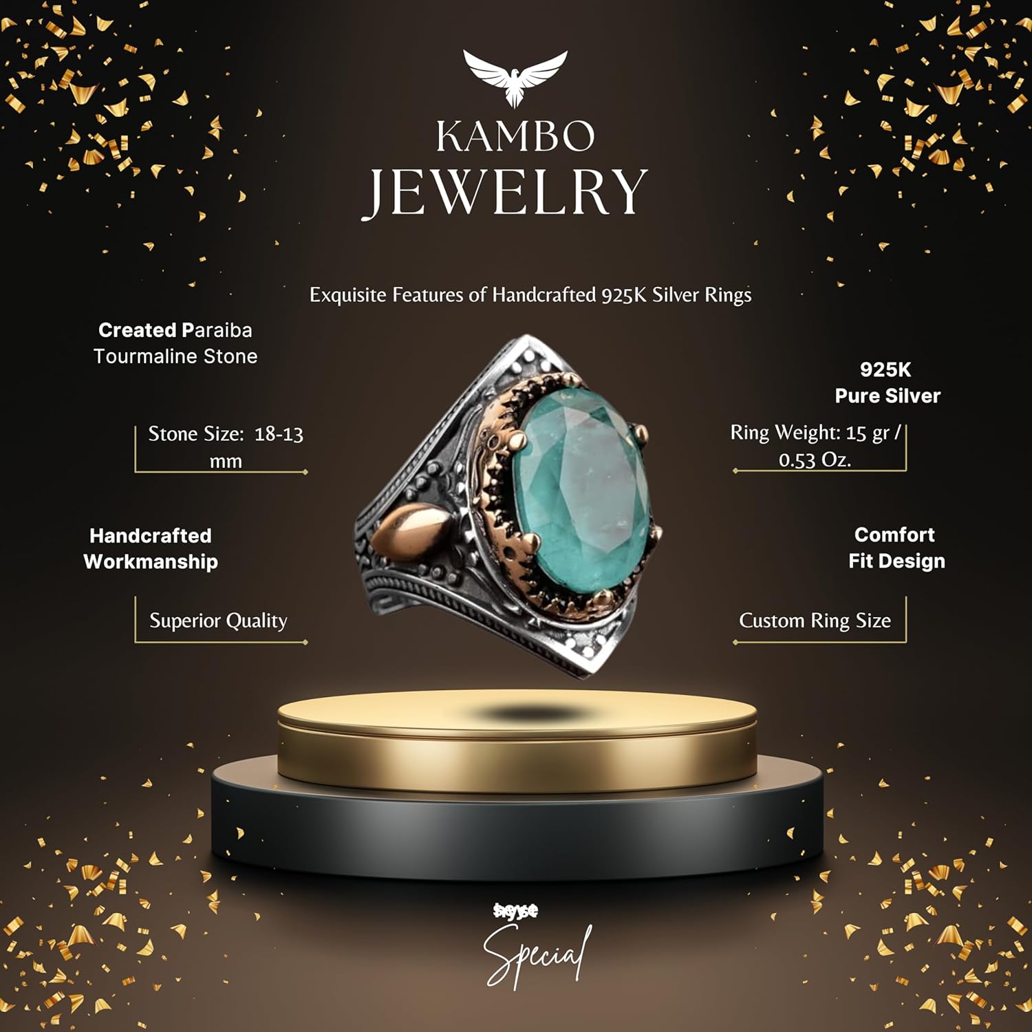 El Yapımı Taşlı Erkek Yüzük - 925 Ayar Gümüş Erkek Yüzük, Farklı ve Özgün Tasarım (Yapay Yeşil Paraiba)