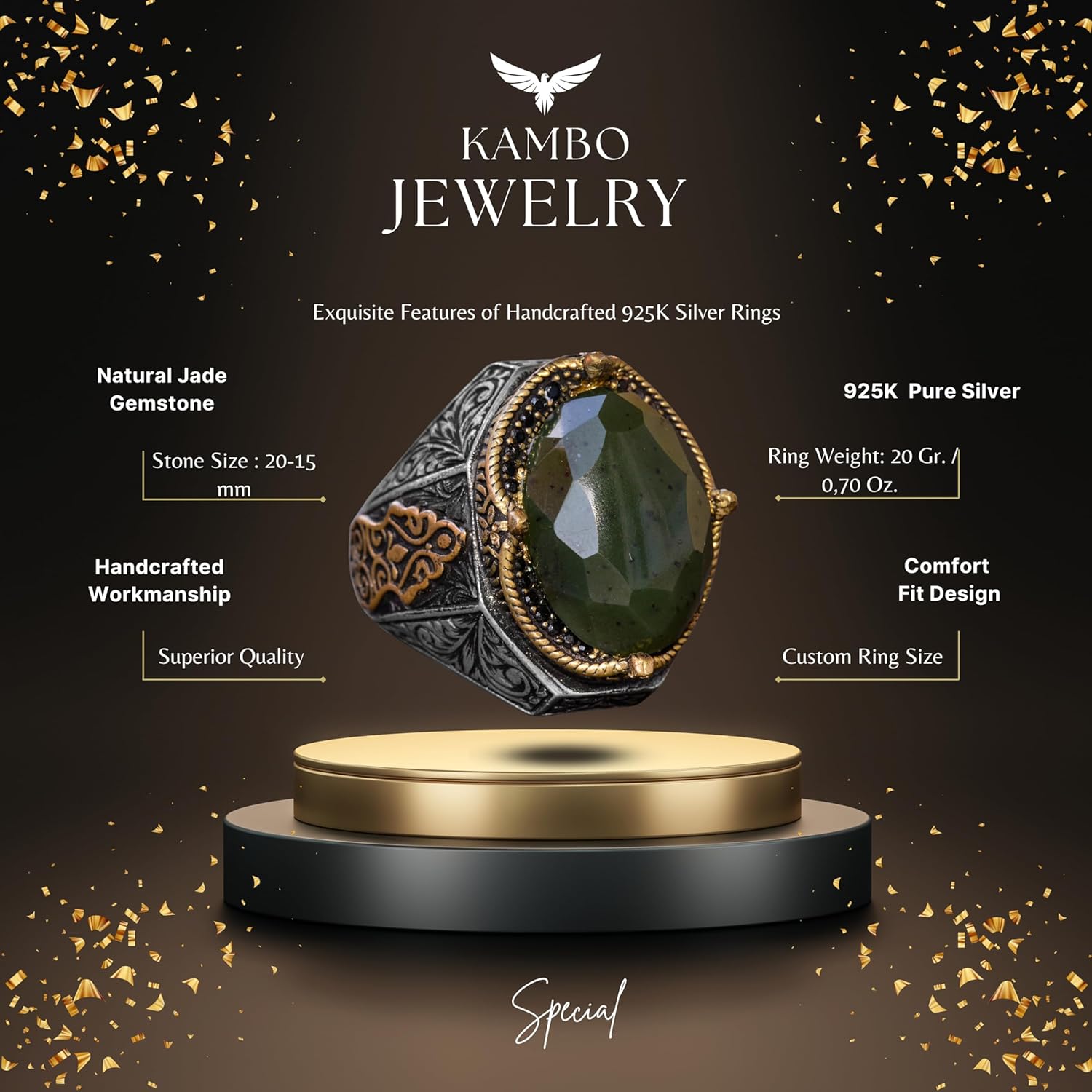 El Yapımı Vintage Tasarım Zümrüt Yüzük - 925 Ayar Gümüş Erkek Yüzük Altın Detaylarla (Jade)