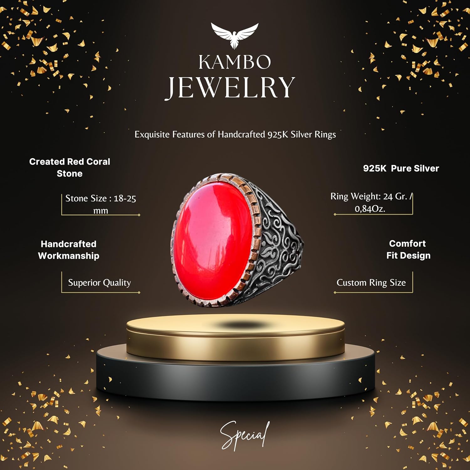El Yapımı Yüzük, Yapay Mercan Taşı, Sterlin Gümüş Erkek Büyük Yüzük - Tutku ve Koruma Sembolü