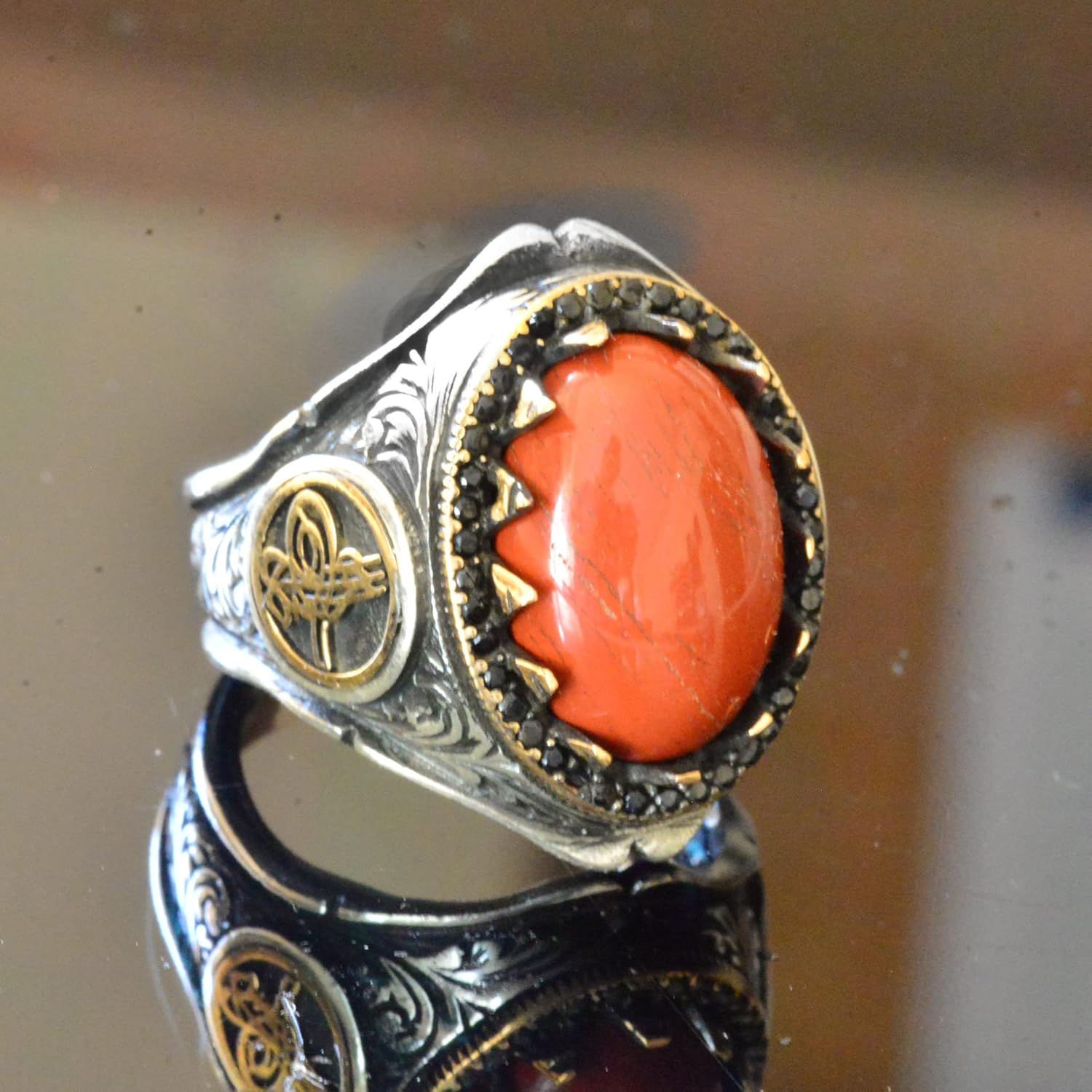 Erkekler için 925 Ayar Gümüş İslami Yüzük - Doğal Akik Taşı ile Elle Oyulmuş Hat Sanatı