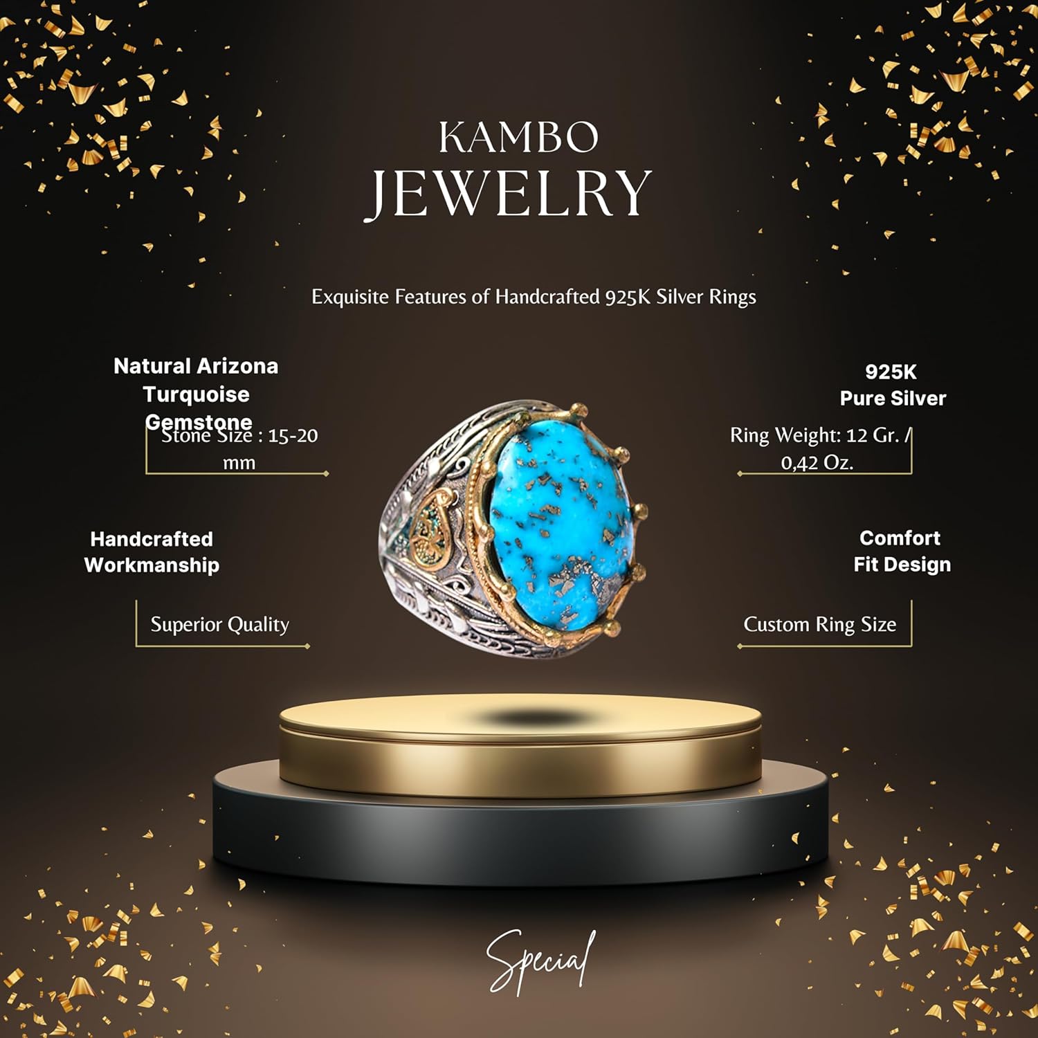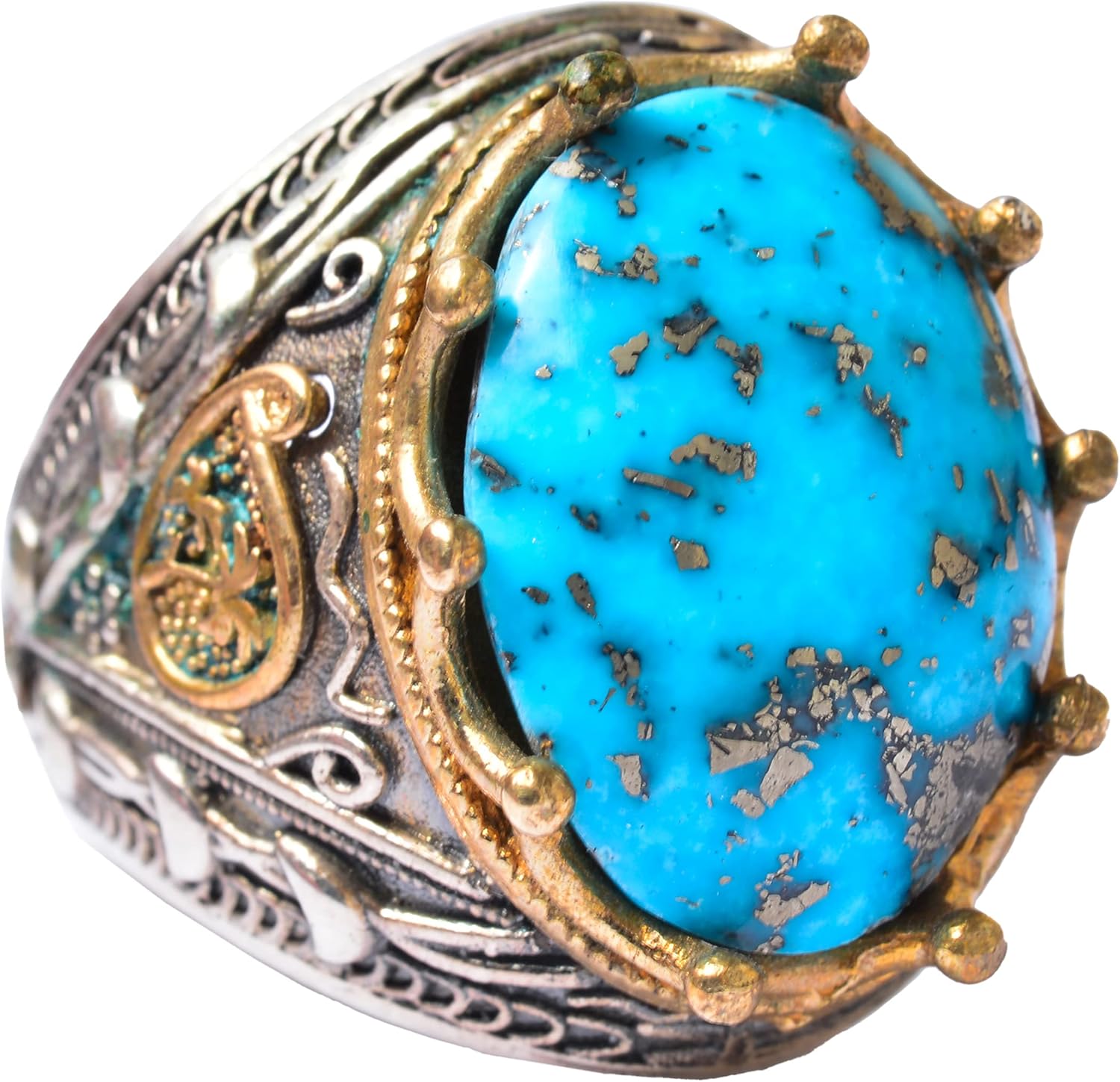 Erkekler için 925 Ayar Gümüş Sultan Yüzük - Doğal 10 Karat Arizona Turkuaz Taşı