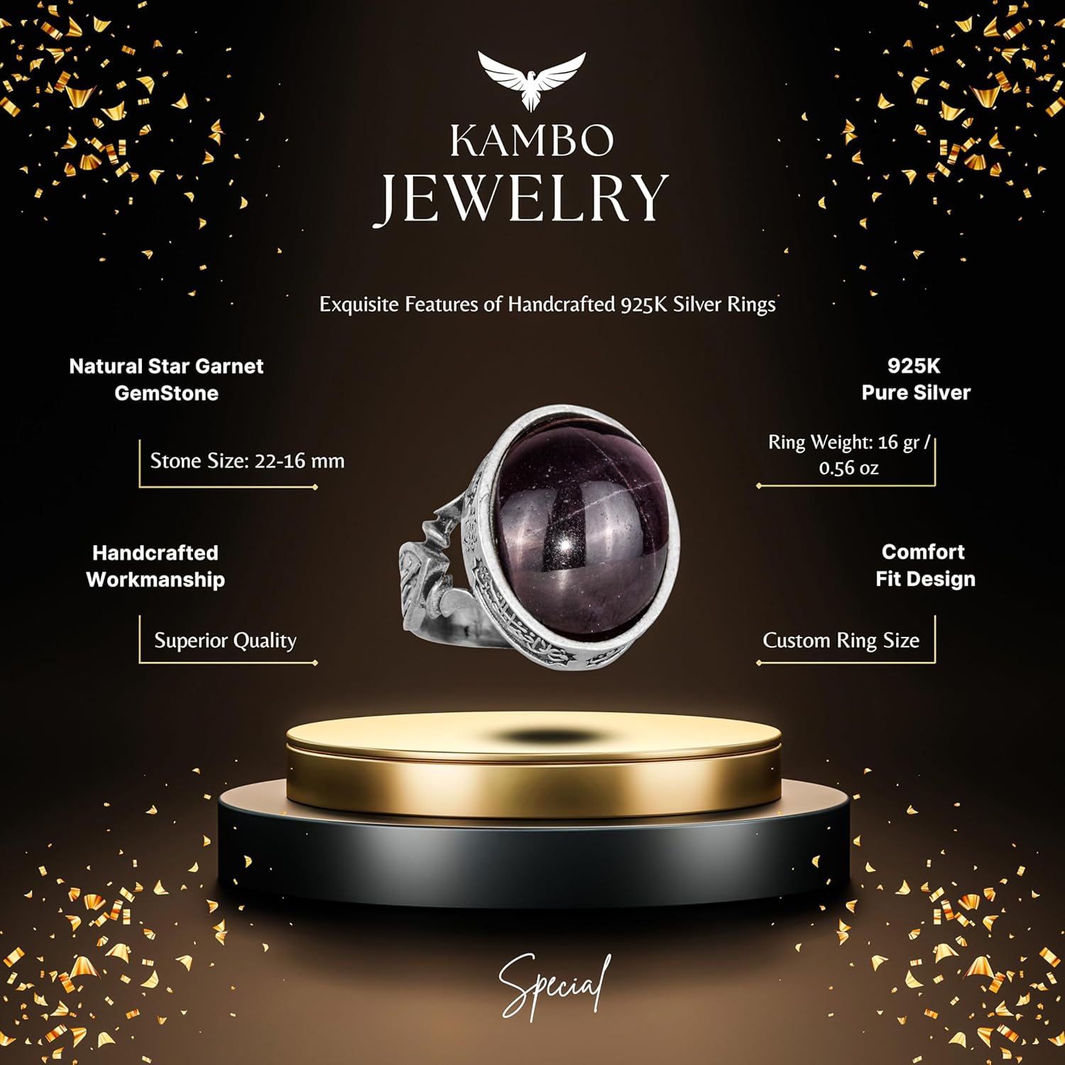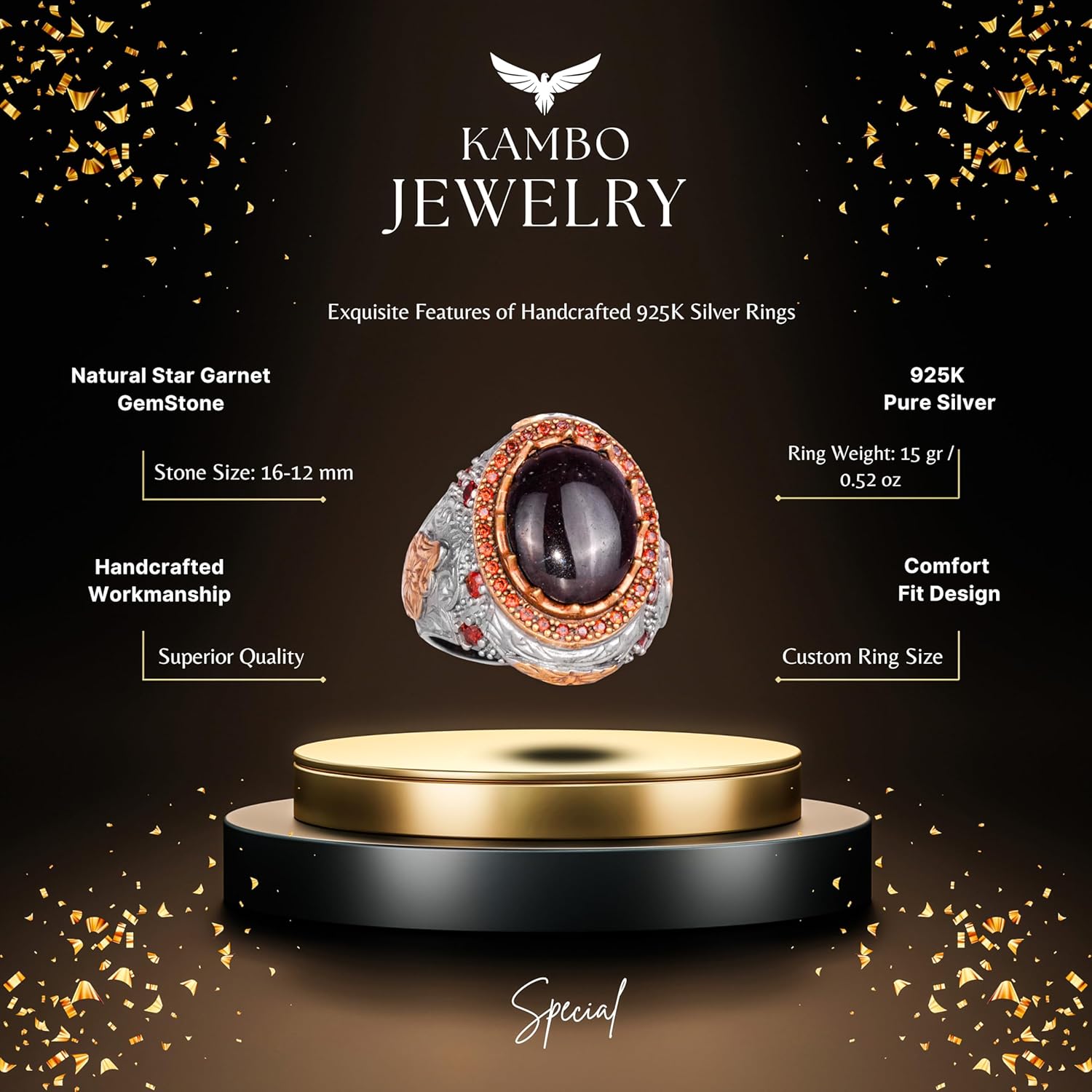 Erkekler için 925 Ayar Gümüş Yüzük - Doğal Yıldız Granat Taşı ile El Yapımı Vintage Tasarım, Ayrıntılı Kırmızı Taş Vurguları ile