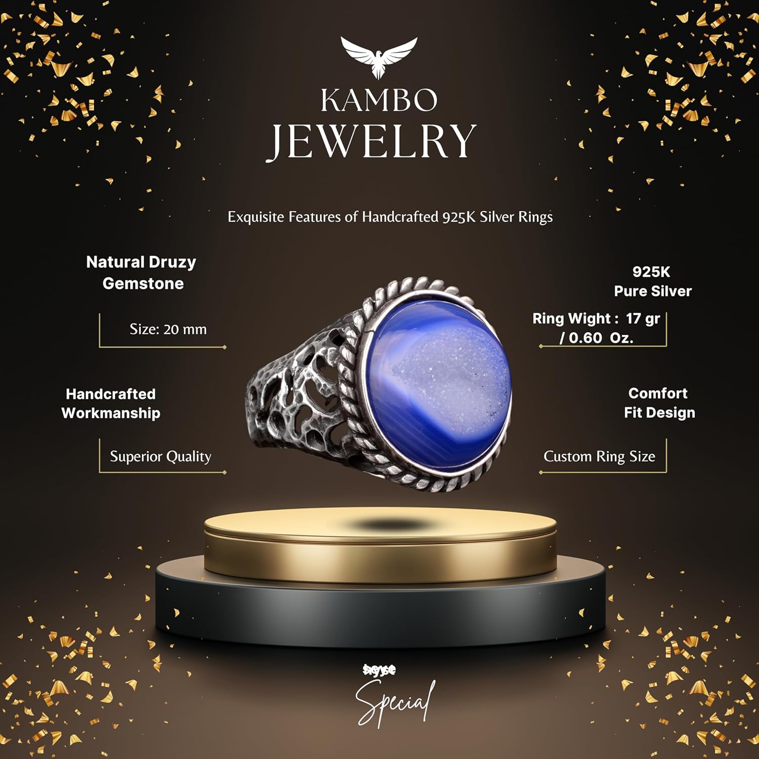 Erkekler için 925 Ayar Gümüş Yüzük ile Doğal Druzy Kuvars Taş