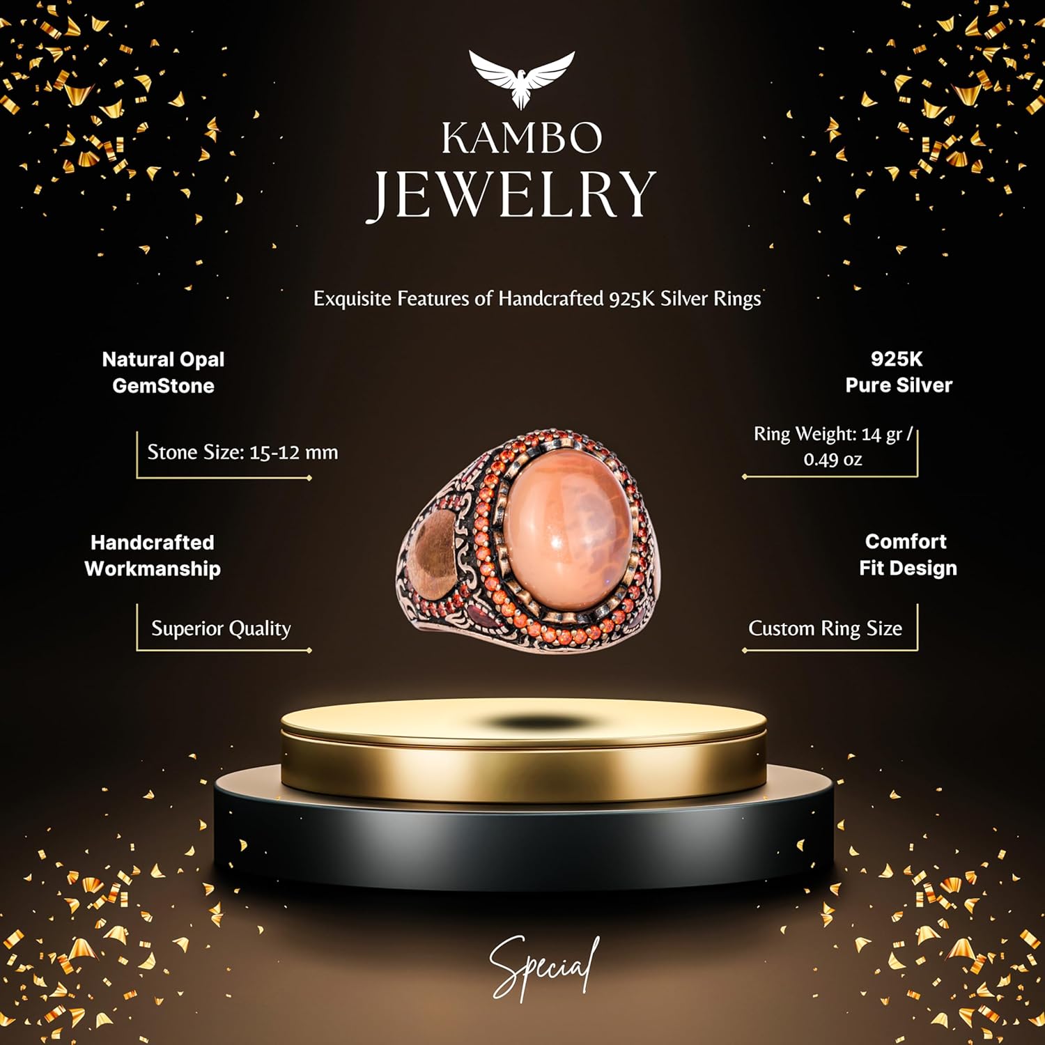 Erkekler için 925 Ayar Gümüş Yüzük - Gerçek Doğal Opal Taşı ile El Yapımı Sultan Desenli Tasarım