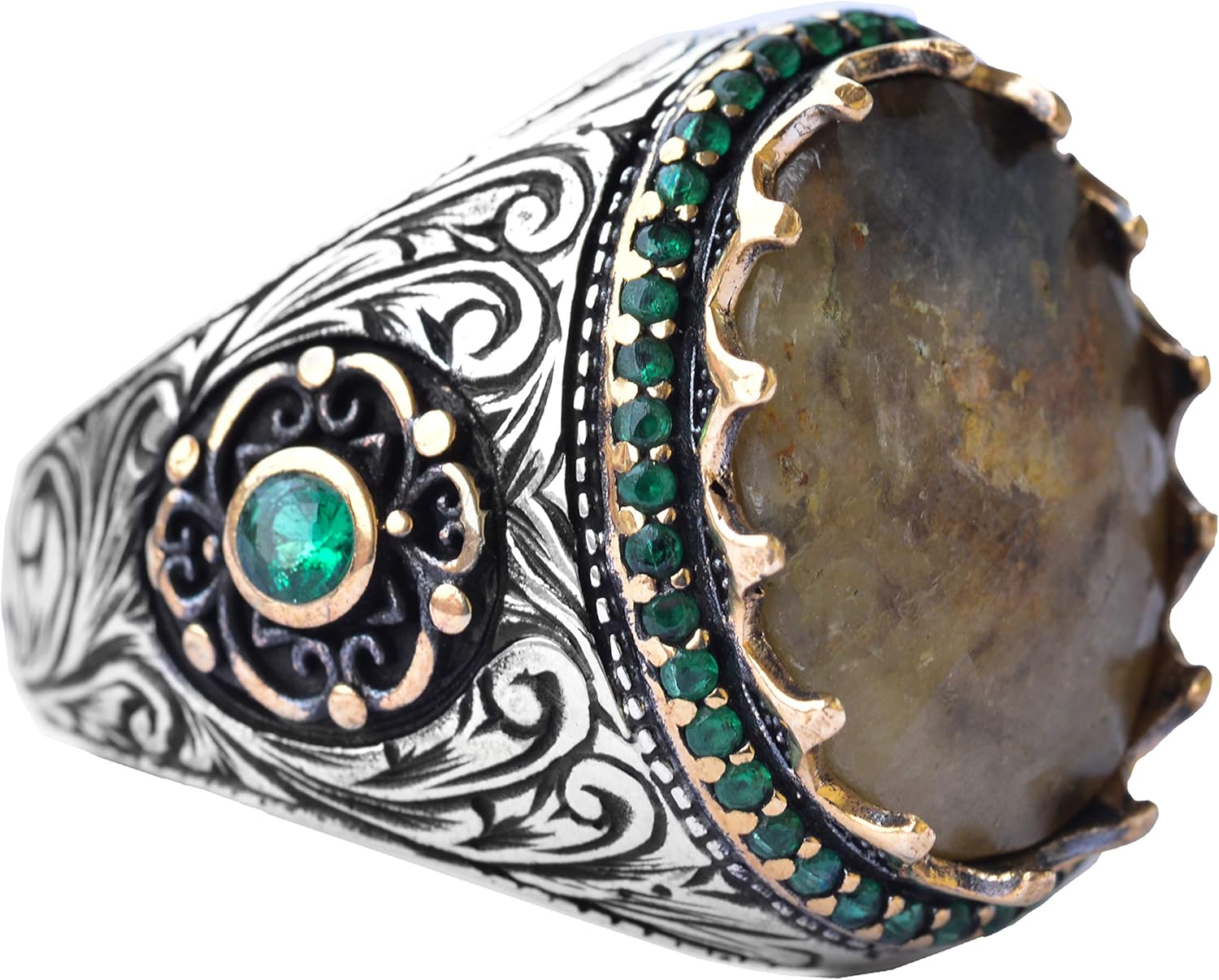 Erkekler için 925 Ayar Gümüş Yüzük - Kurt ve Hilal Sembolü ile Süslenmiş ve Doğal Taşlar ile Bezenmiş