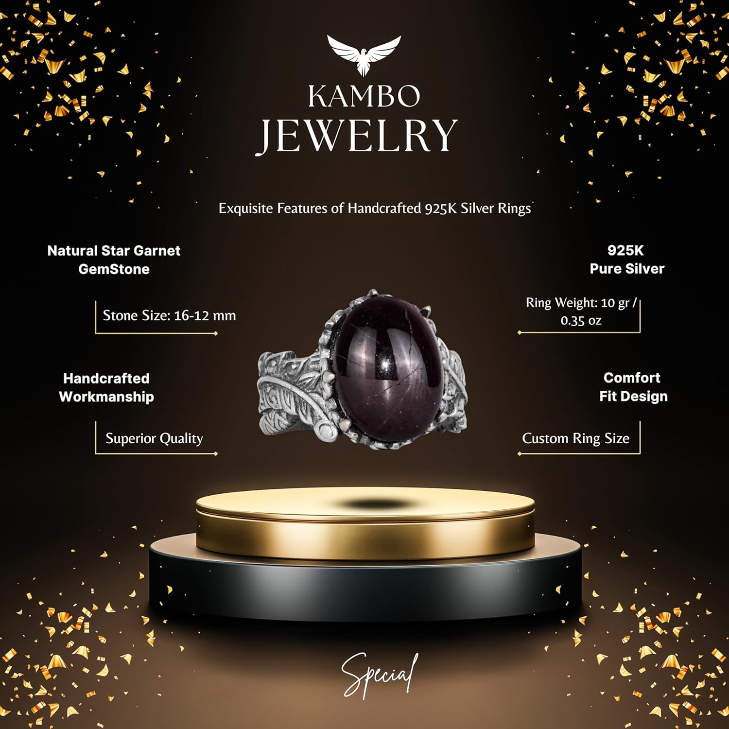 Erkekler için 925 Ayar Gümüş Yüzük ile Doğal Yıldız Garnet Taşı - El Yapımı Yaprak Desenli İfade Yüzüğü