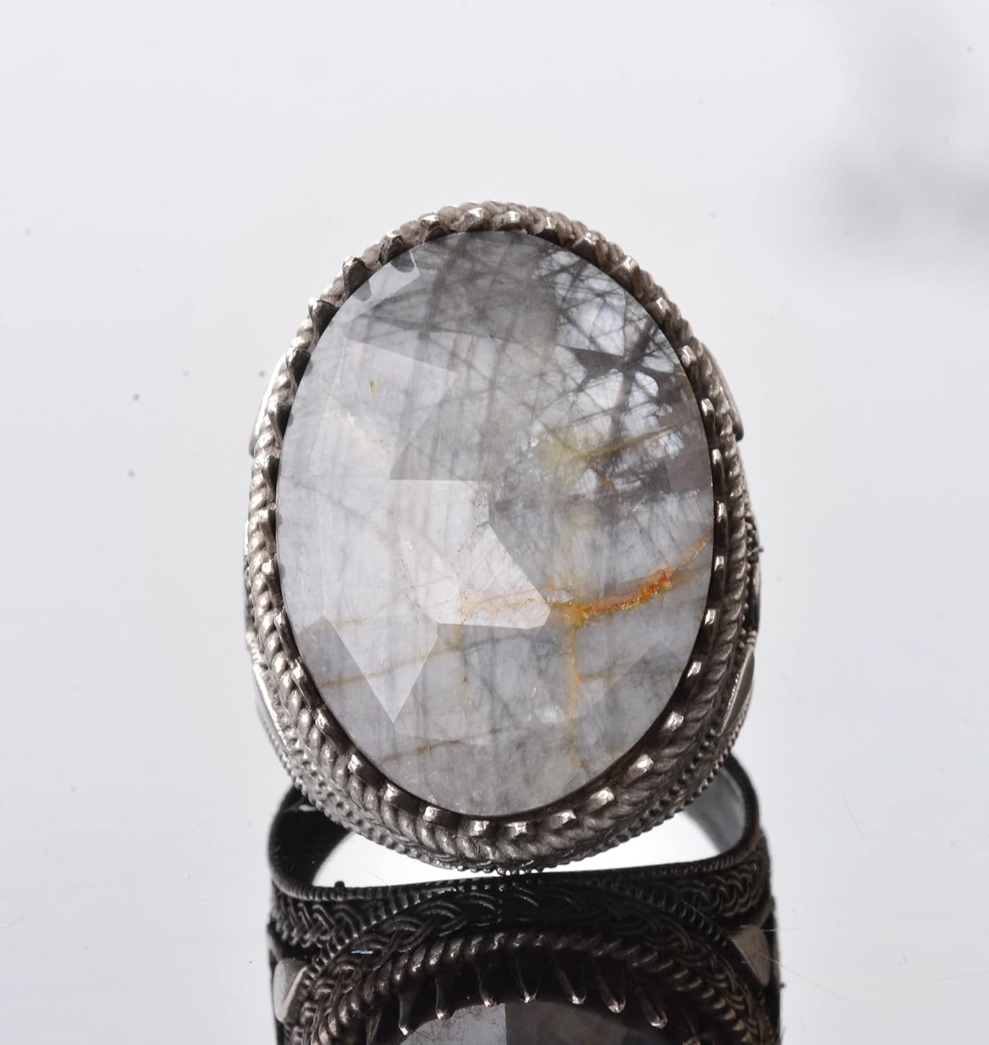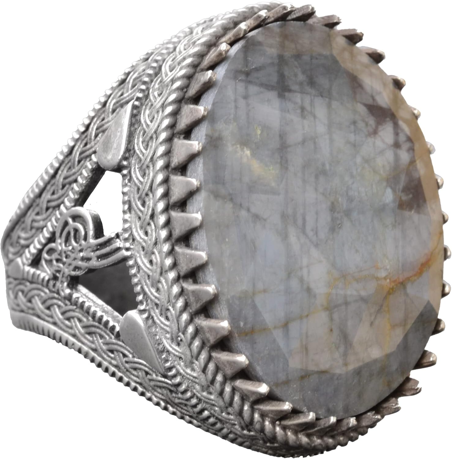 925 Ayar Gümüş Erkek Yüzük ile Doğal Labradorit Taşı - Detaylı Etnik Tasarım - El Yapımı Gümüş Yüzük