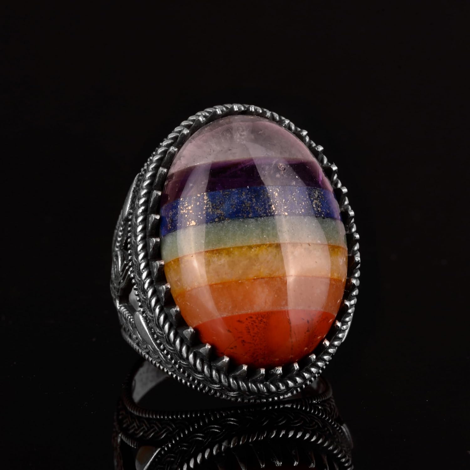 925 Ayar Gümüş Erkek Yüzük, 7 Çakra Doğal Taşı Yüzük, Gökkuşağı Yüzük, Tuğra Yüzük