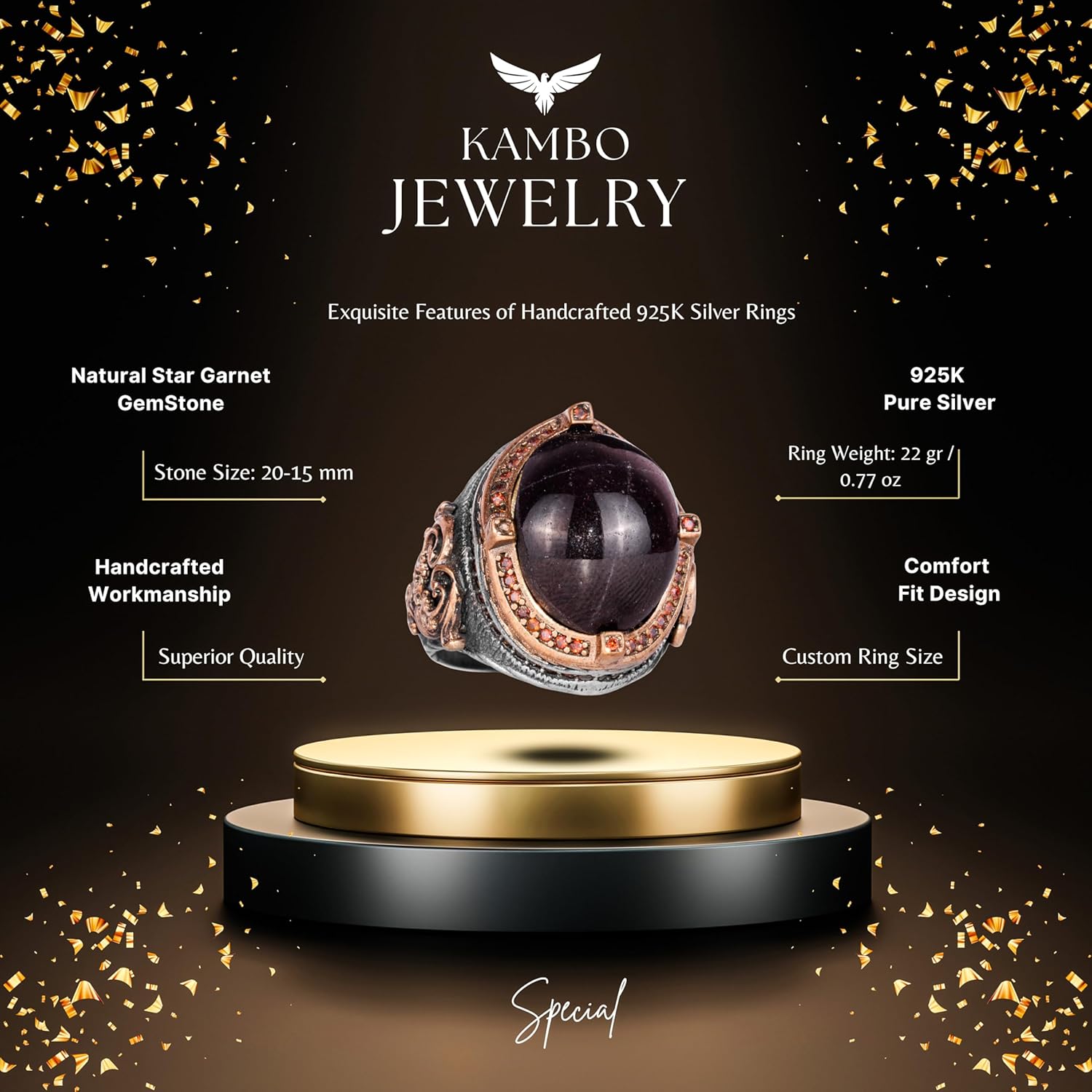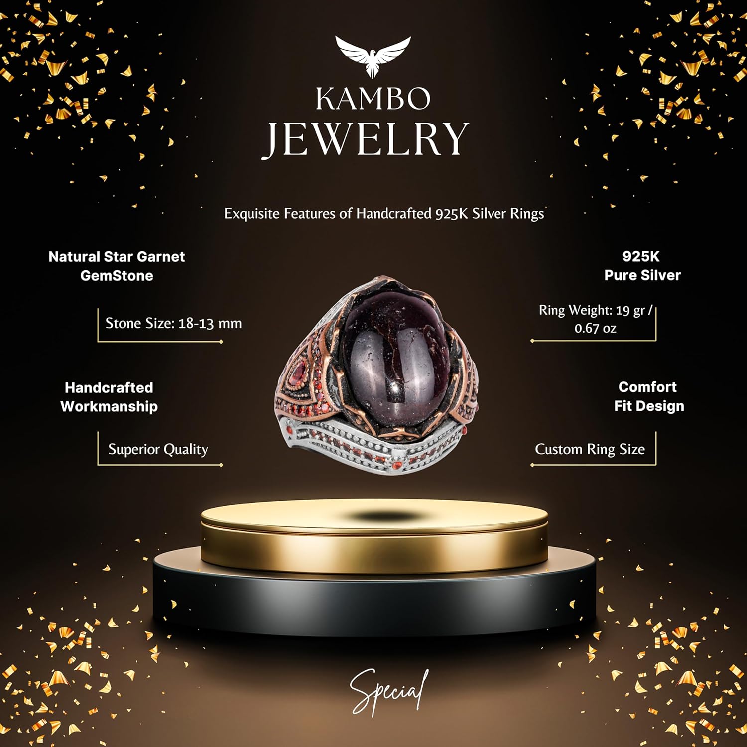 925 Ayar Gümüş Erkek Yüzük Doğal Yıldız Granat Taşı ile - El Yapımı Gümüş Takı, Erkekler İçin Hediyeler