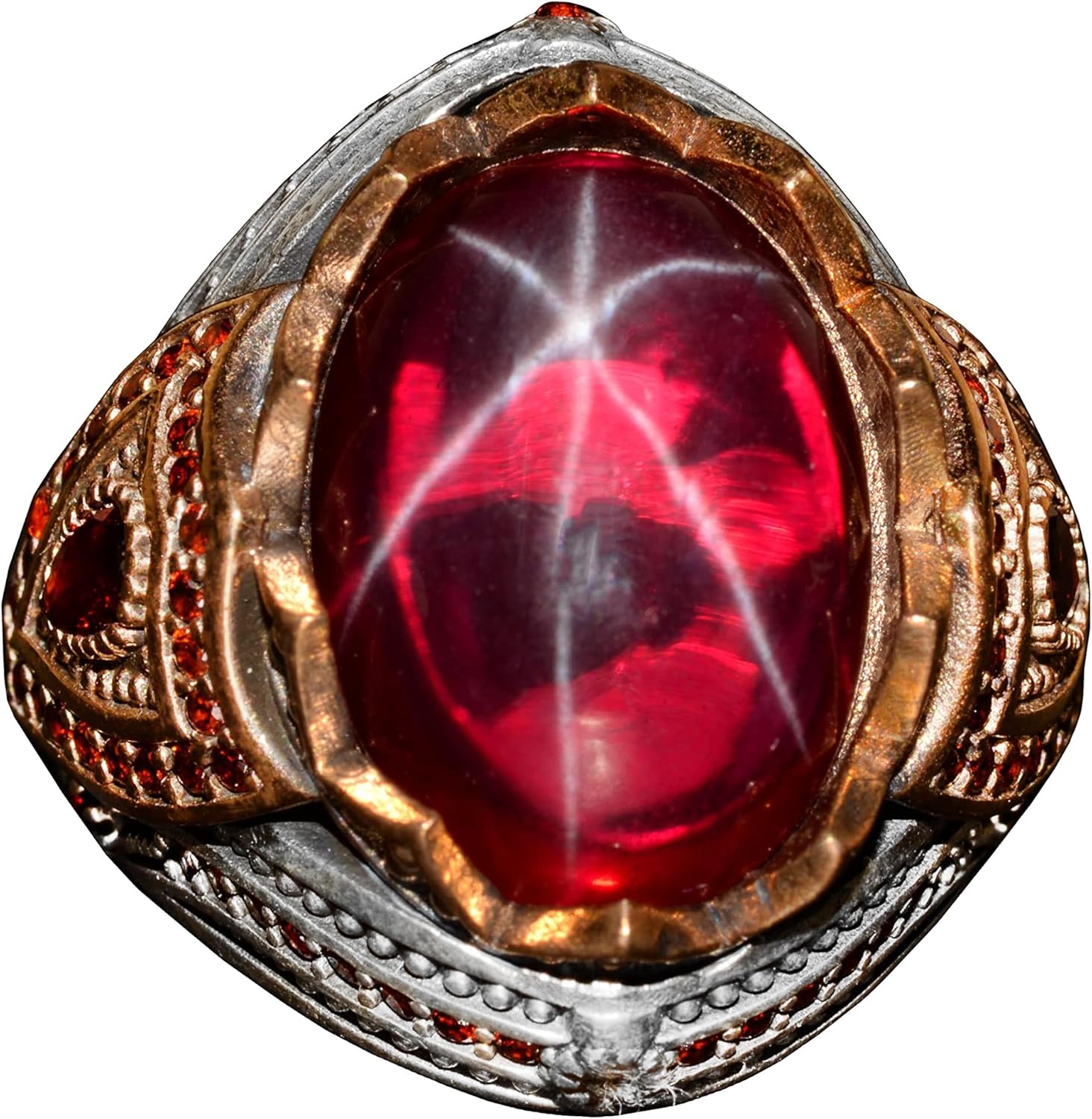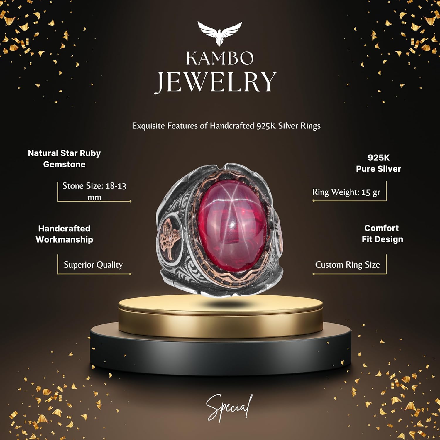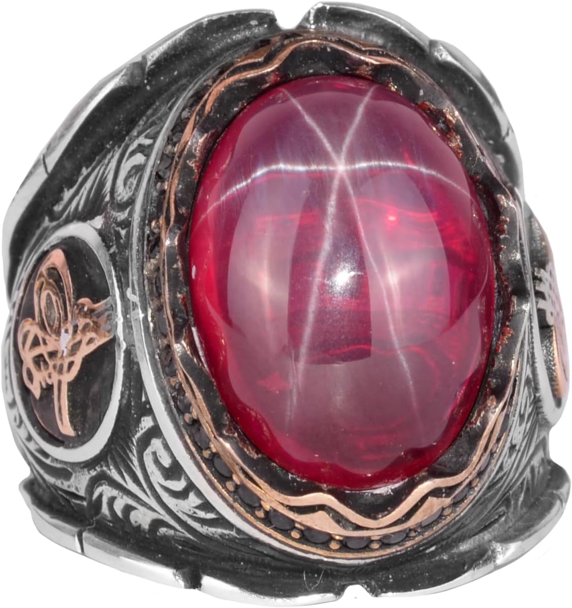 925 Ayar Gümüş Erkek Yüzük, El Yapımı Doğal Star Ruby Taşlı Yüzük, Osmanlı Tuğra Gümüş Yüzük
