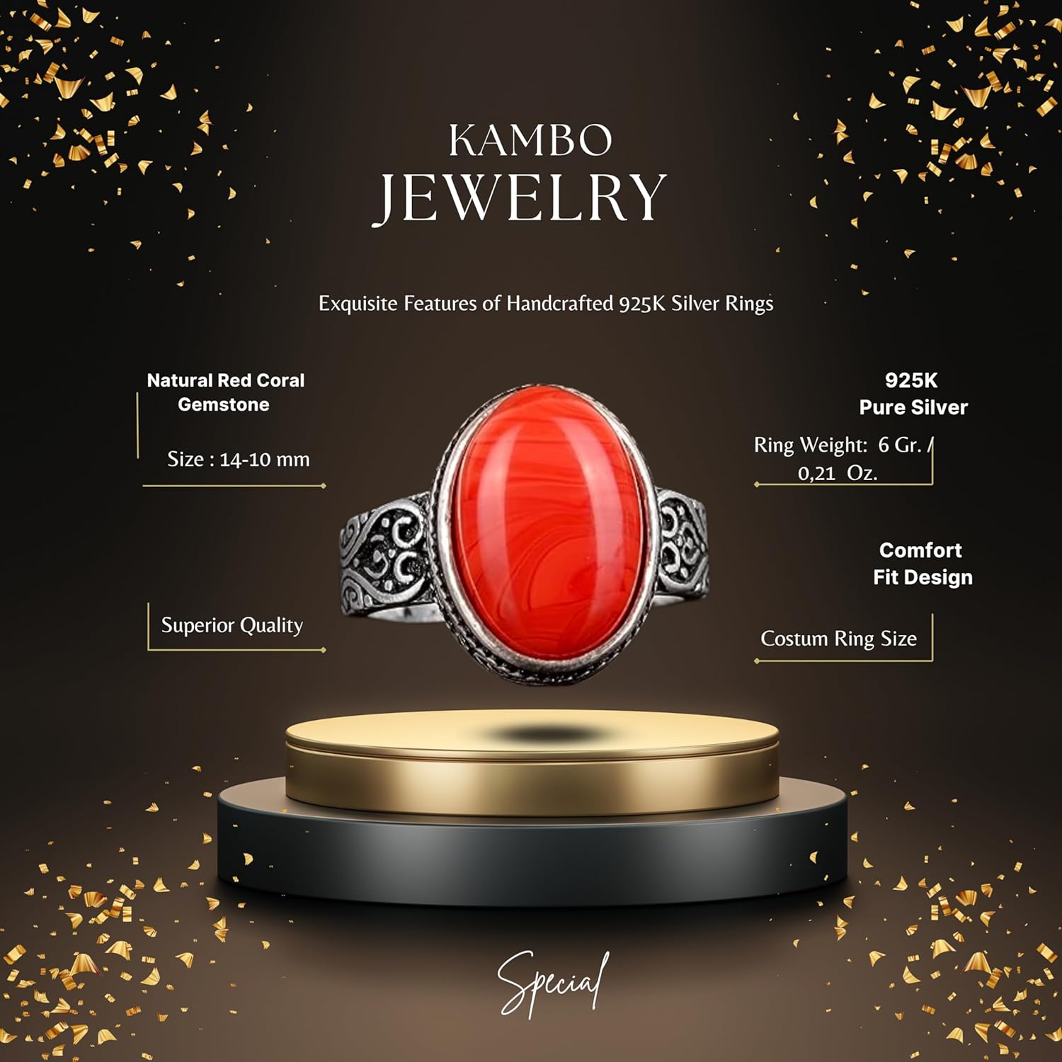925 Ayar Gümüş Erkek Yüzük, Doğal Taş Yüzük, Kırmızı Mercan Taşı, Gümüş Takı, Mercan Taşı Yüzük