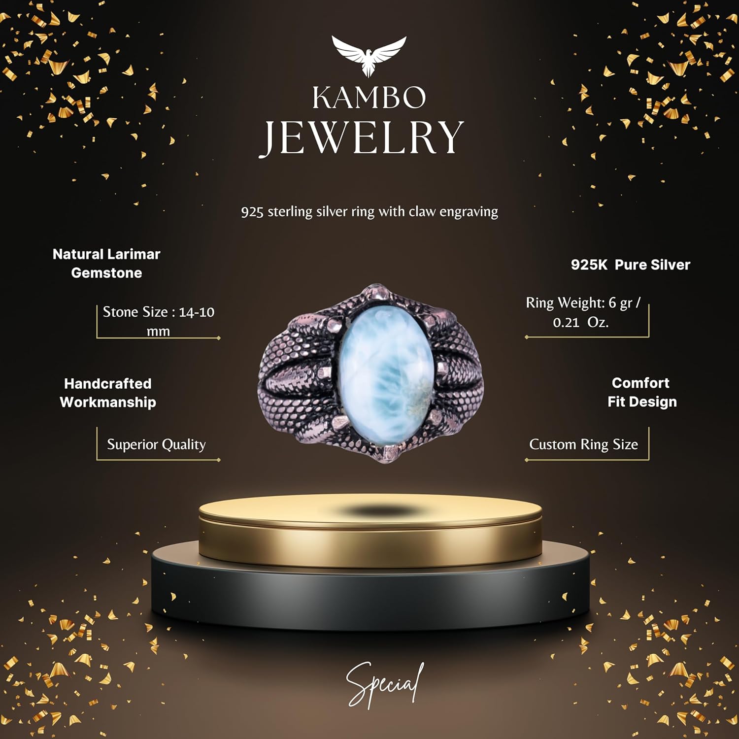 925 Ayar Gümüş Erkek Yüzük, Doğal Taşlı, El Yapımı Vintage Tasarım Pençeli Yüzük (Larimar)