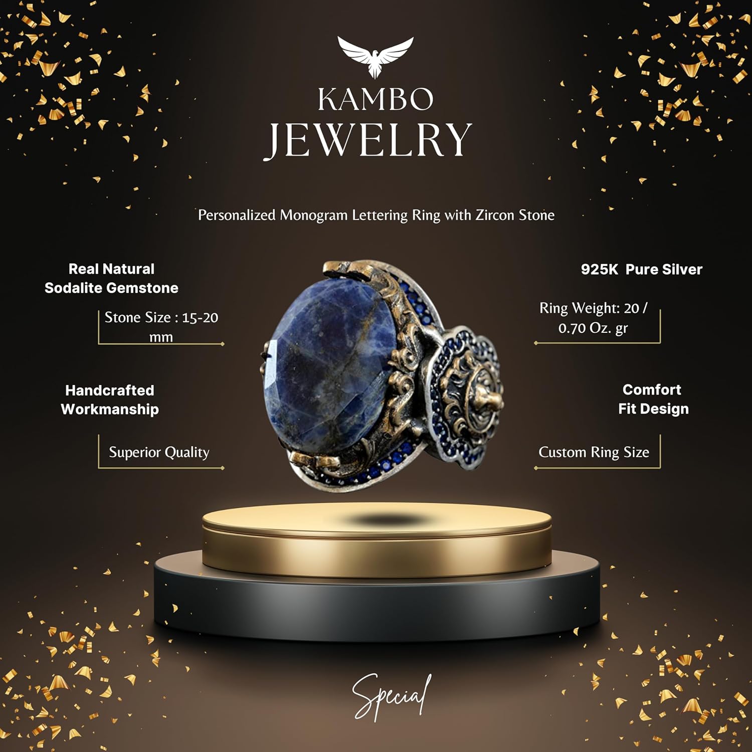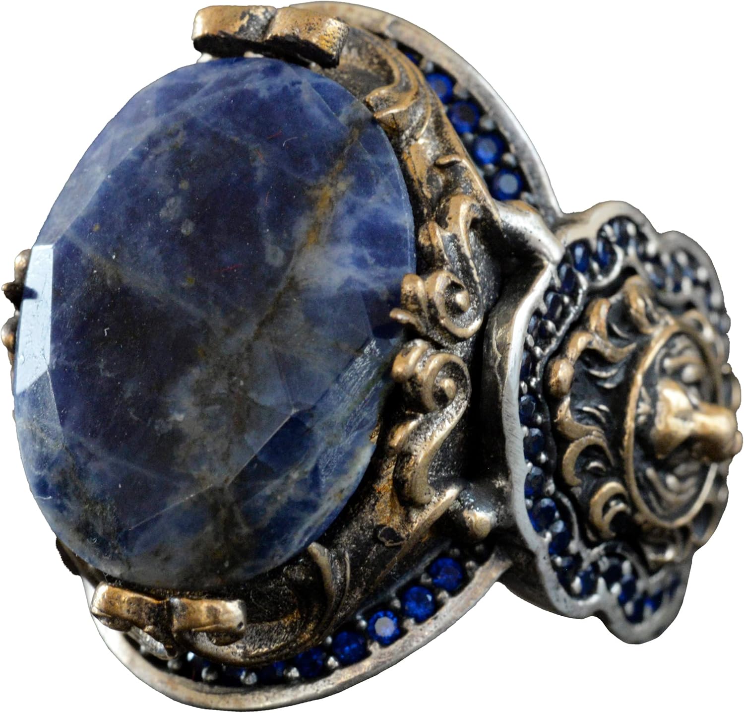 925 Ayar Gümüş Erkek Yüzük, Doğal Sodalit Taşı ve Aslan Tasarımı ile