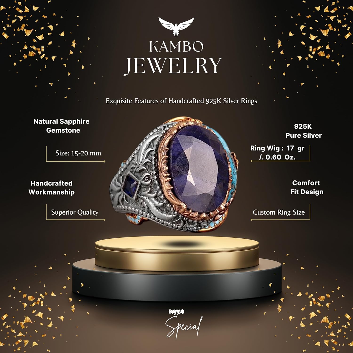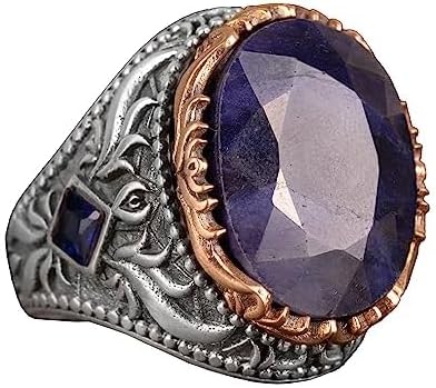925 Ayar Gümüş Erkek Yüzük, Gerçek Doğal Safir Taşlı Yüzük, El Yapımı Yüzük