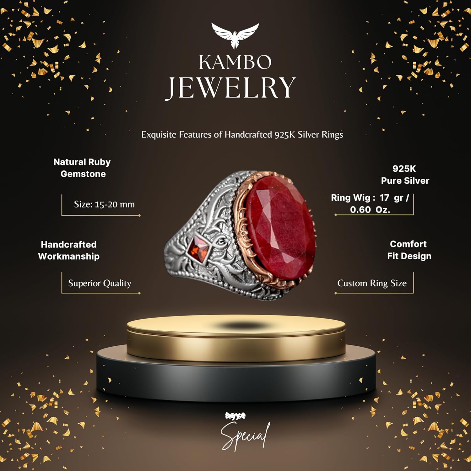925 Ayar Gümüş Erkek Yüzük, Gerçek Doğal Yakut Taşlı Yüzük