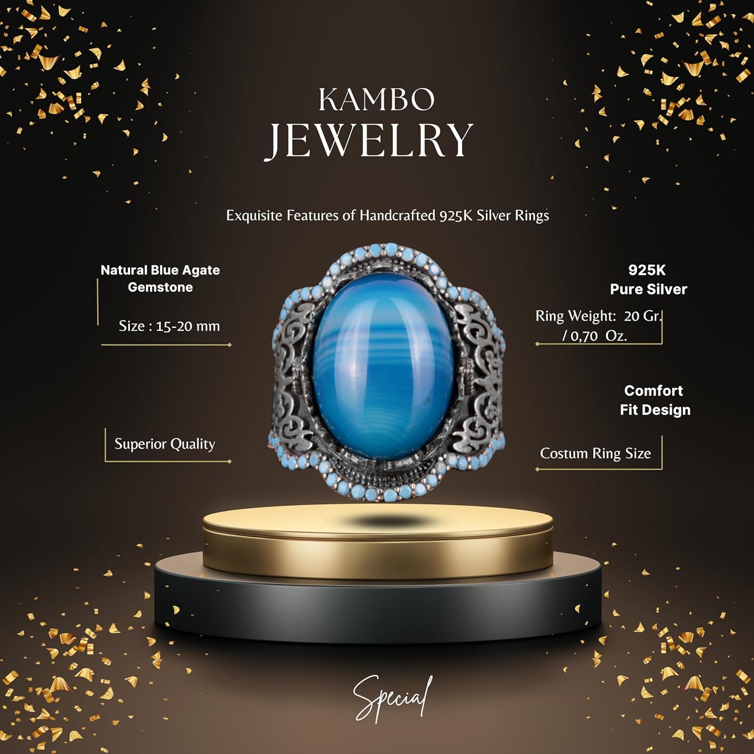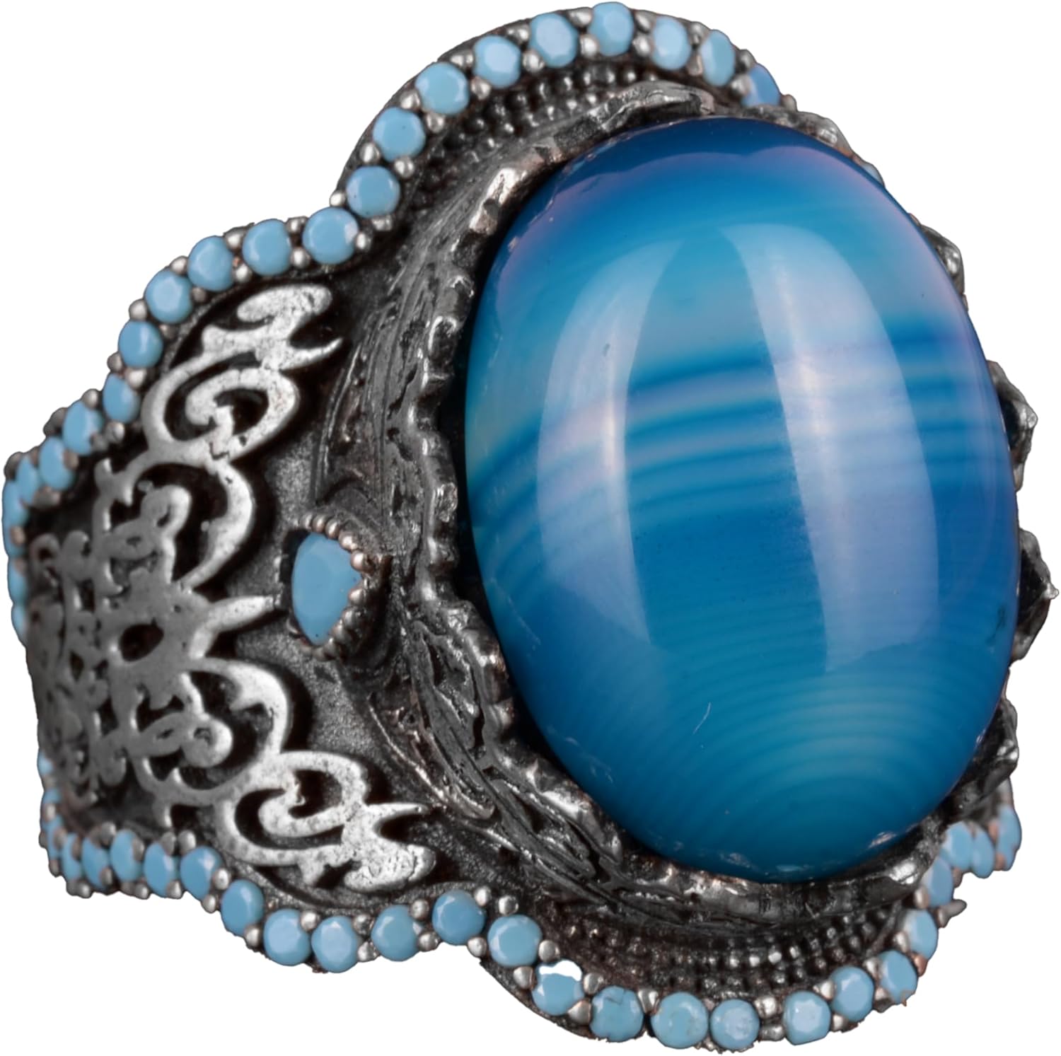 925 Ayar Gümüş Erkek Yüzük, Gerçek Doğal Mavi Akik Taşı, Sultan Yüzüğü
