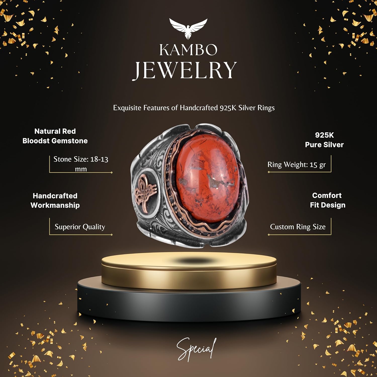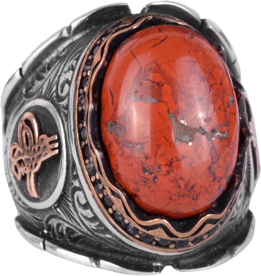 Osmanlı Tuğrası Gümüş Yüzük, 925 Ayar Saf Gümüş Yüzük, El Yapımı Doğal Kırmızı Kan Taşı Yüzük