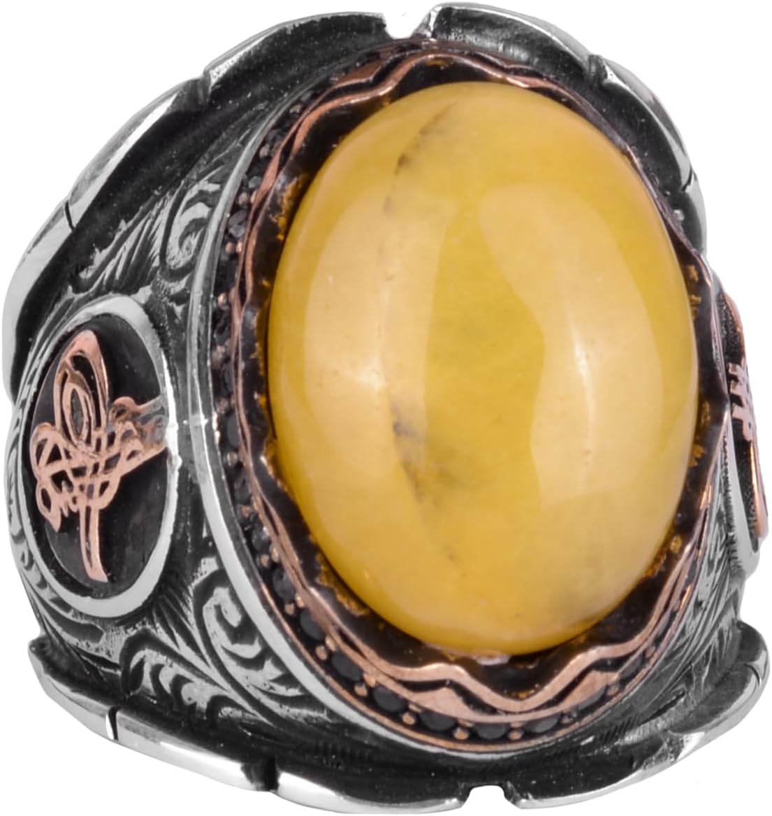 Osmanlı Tuğra Gümüş Yüzük, Doğal Sarı Akik Taşlı Yüzük, 925 Ayar Gümüş Yüzük Erkekler İçin